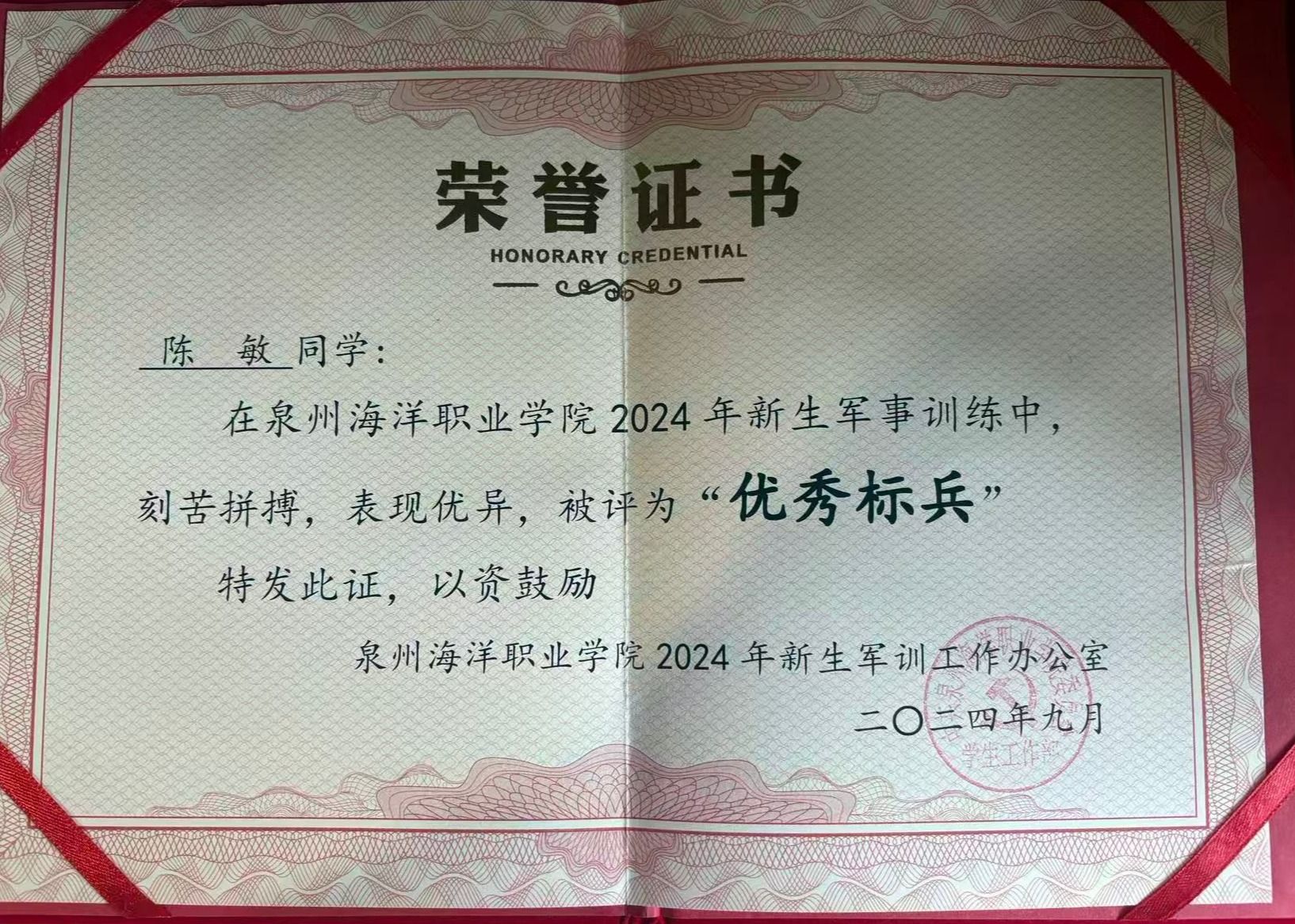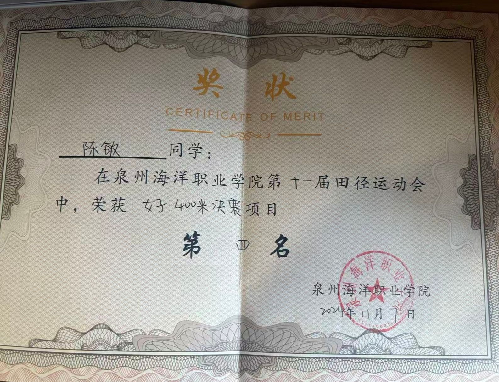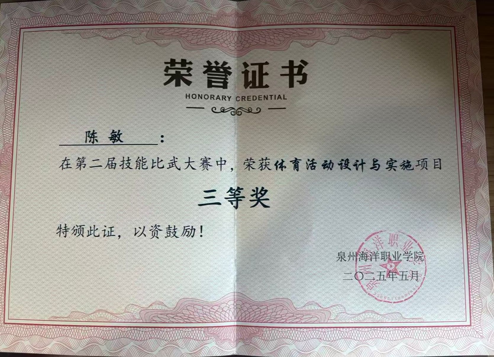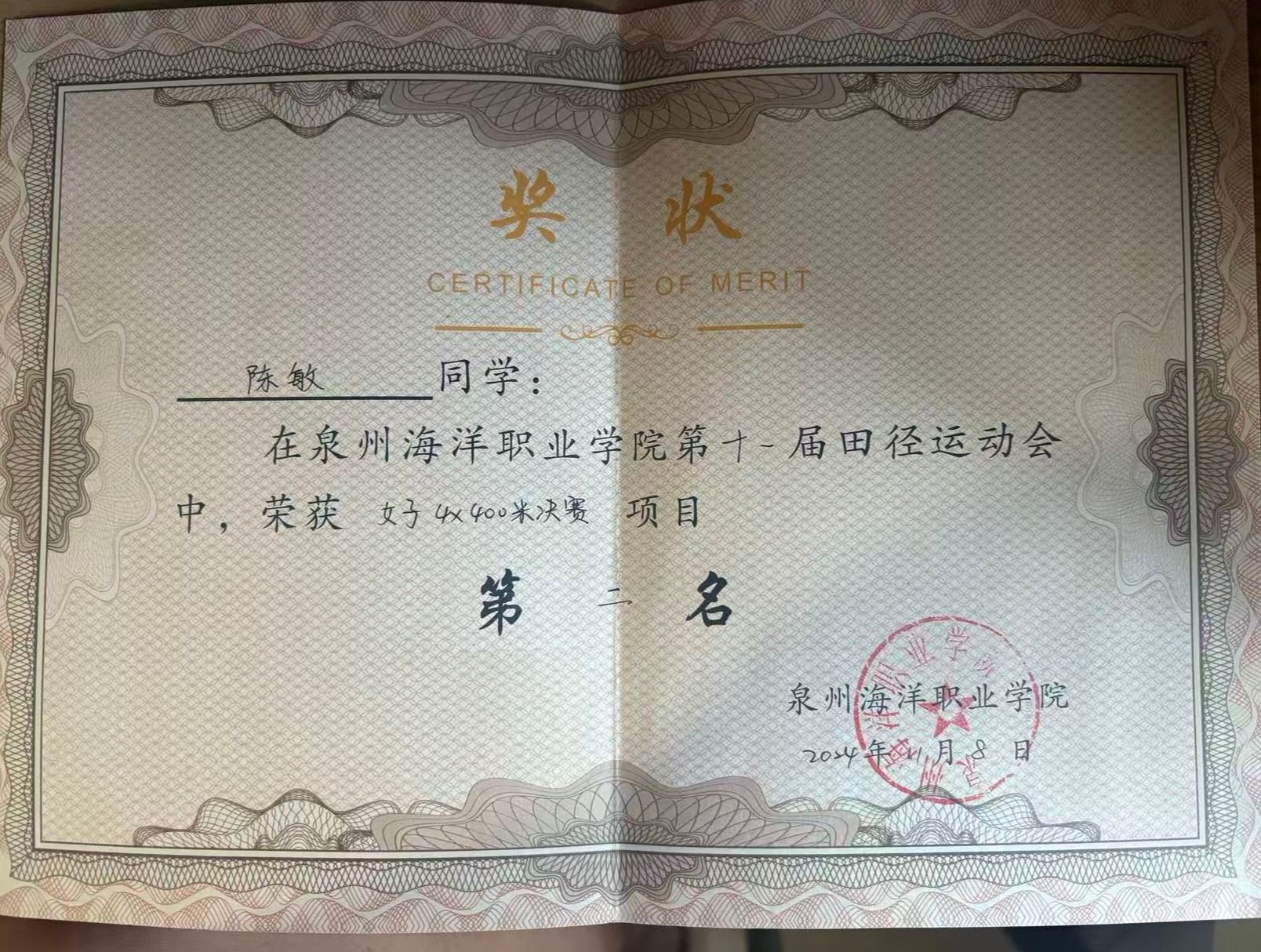 陈敏,女,共青团员,健康休闲学院社会体育专业2402班班长,兼辅导员助理一职。2024—2025学年专业成绩排名2/173,综合测评成绩2/173。曾获泉州海洋职业学院“优秀学生标兵”“优秀学生干部”荣誉称号、荣获第十一届田径运动会400米第四名。持有计算机一级等级证书、普通话二甲证书。志愿服务时长67小时。
