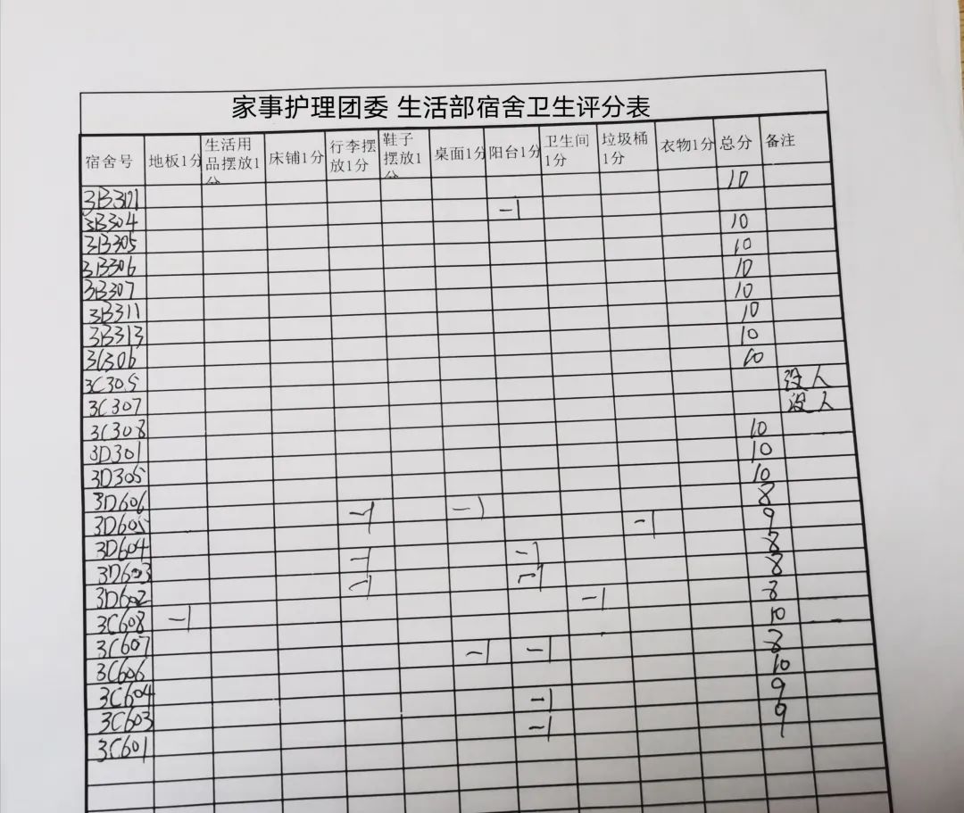 本次卫生检查,分成十个方面进行评分,分别是:地板、生活用品摆放、床铺、行李摆放、鞋子摆放、桌面状况、阳台、卫生间、垃圾桶、衣物