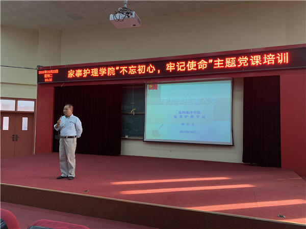 在《和19级新生谈入党》的党课上,陈经义书记主要讲了三个问题,1、青年学生为什么积极申请入党?2、要怎样以实际行动积极争取入党?3、入党申请书书写的要求。陈书记从党的发展历史、大学生的成长需求,理想与信念对青年大学生成长的重要意义等方面,以大量生动的事例和自己的亲身经历,有理论,有实例,深入浅出,通俗易懂,深受同学们的欢迎。