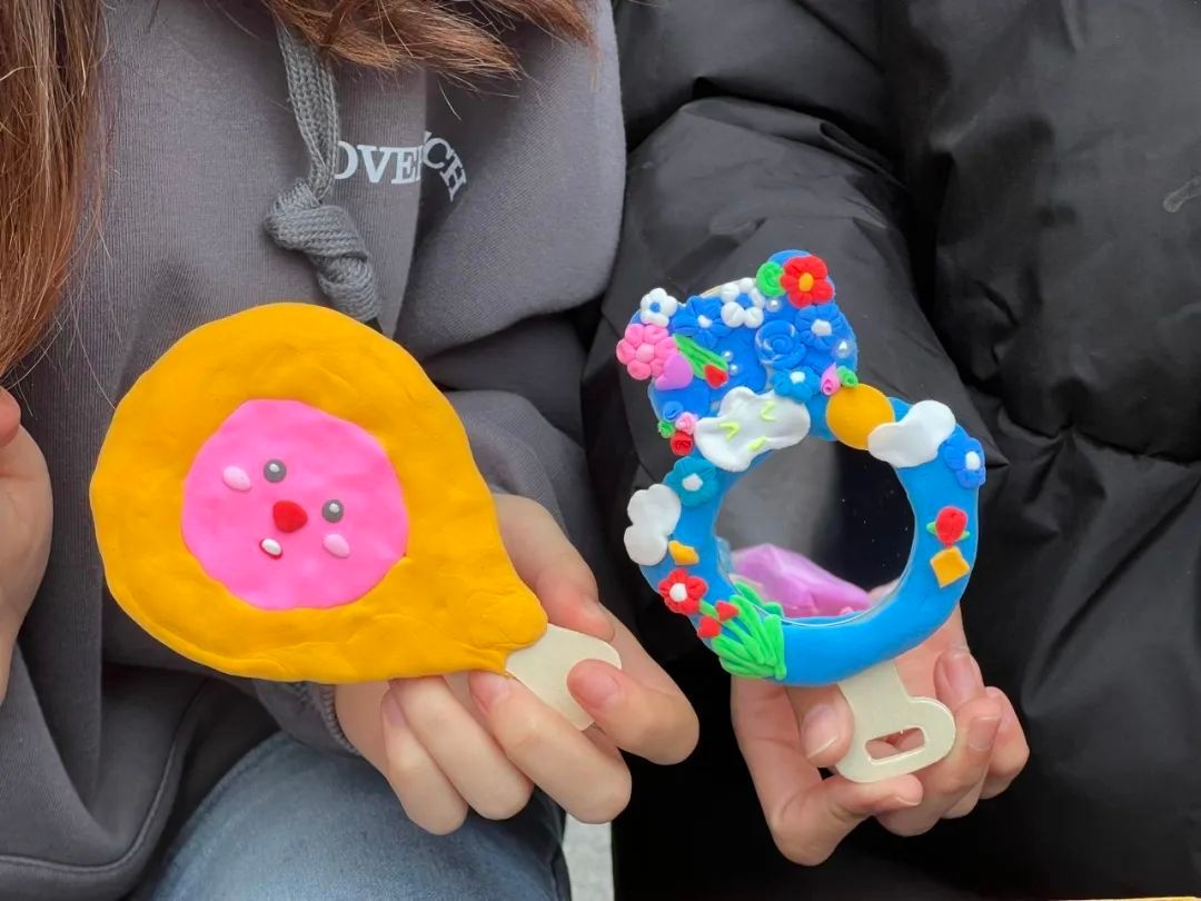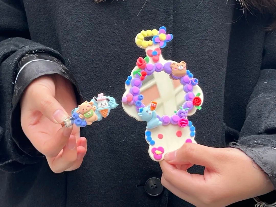 活动现场欢声笑语此起彼伏,大家充分发挥自己的想象力和创造力,灵巧的双手在材料的摆弄间忙碌着,待胶完全凝固后,一个个独一无二的创意发卡和镜子闪亮登场。