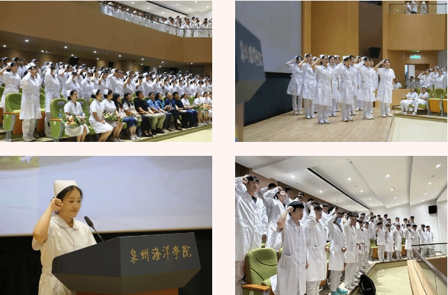 石狮市总医院护理部主任邱明霞等来宾及教师代表为我校2022级300余名即将奔赴临床实践一线的护理学子授帽传烛,并见证他们庄严宣誓。