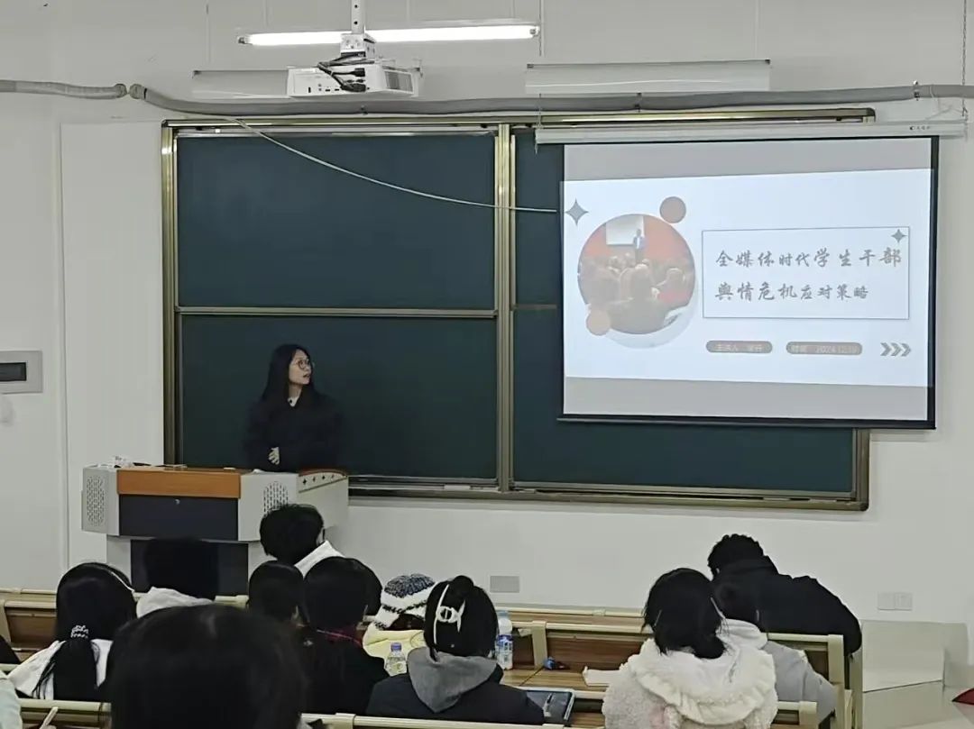 12月19日晚,辅导员李丹老师与学生干部们进行了“全媒体时代,学生干部如何应对舆情危机”大讨论。她强调,在当前信息飞速发展的时代,学会杜绝不当舆论和进行风险防控等意识形态的形成,对学生的健康成长尤为重要。希望每一位学生干部都肩负着准确传达学院声音、积极引导正确舆论走向的重要使命。