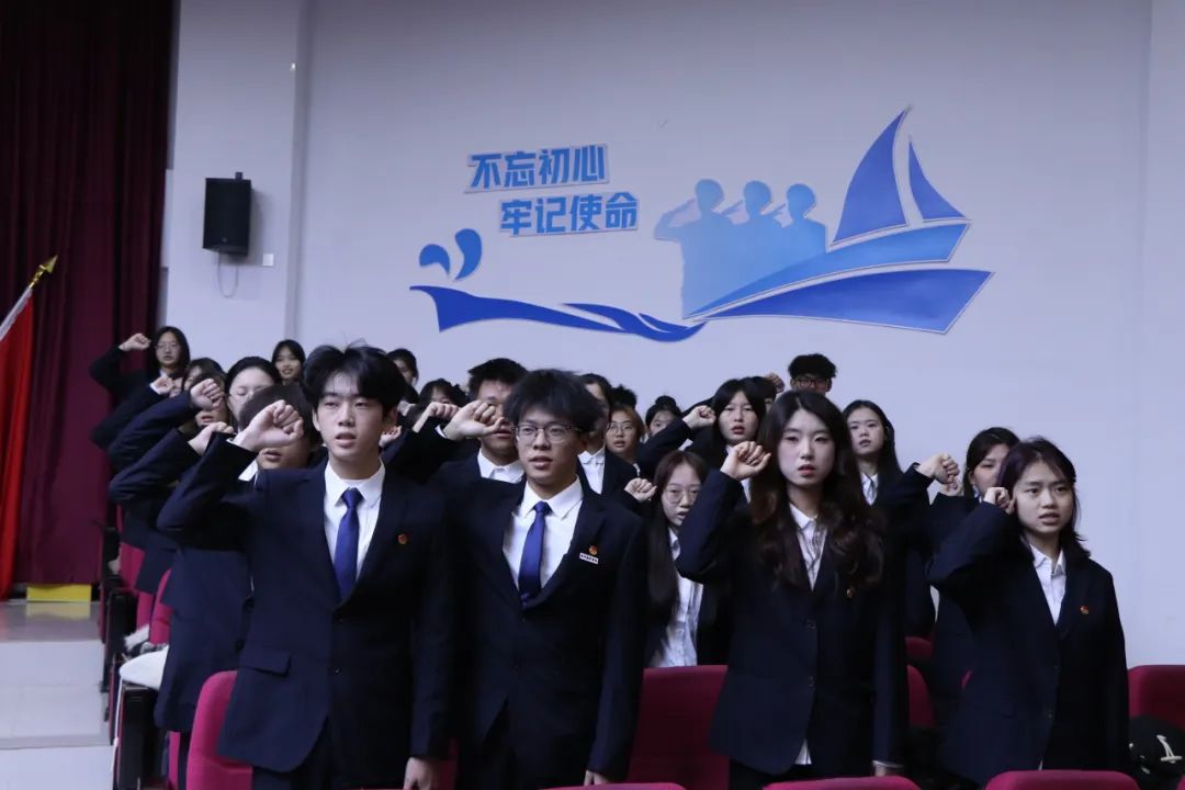随后,社体233班王筱雨同学带领新团员宣誓。新团员们共同举起右拳,面向鲜艳的中国共产主义青年团团旗郑重宣誓,一声声誓言铿锵有力,回荡在会场的每一个角落,是每一位共青团员无悔青春的庄严承诺。