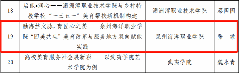 近日,福建省教育厅办公室公布了2025年福建省学校美育浸润行动优秀案例,我院张敏老师的《融海丝文脉,育匠心之美——泉州海洋职业学院“四美共生”美育改革与服务地方双向赋能实践》案例成功入选。