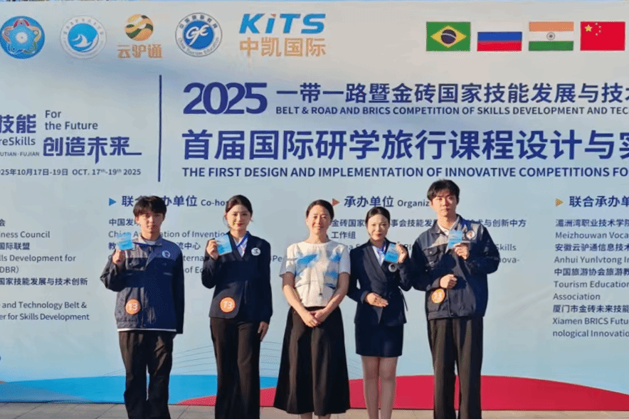 近日,2025“一带一路”暨金砖国家技能发展与技术创新大赛首届国际研学旅行课程设计与实施创新赛项(华南赛区)在莆田圆满落幕。由我院闫花帅老师与航海交通学院潘芳芷老师共同指导,我院严钰柔同学及三位同学组成的代表队荣获职教组三等奖。