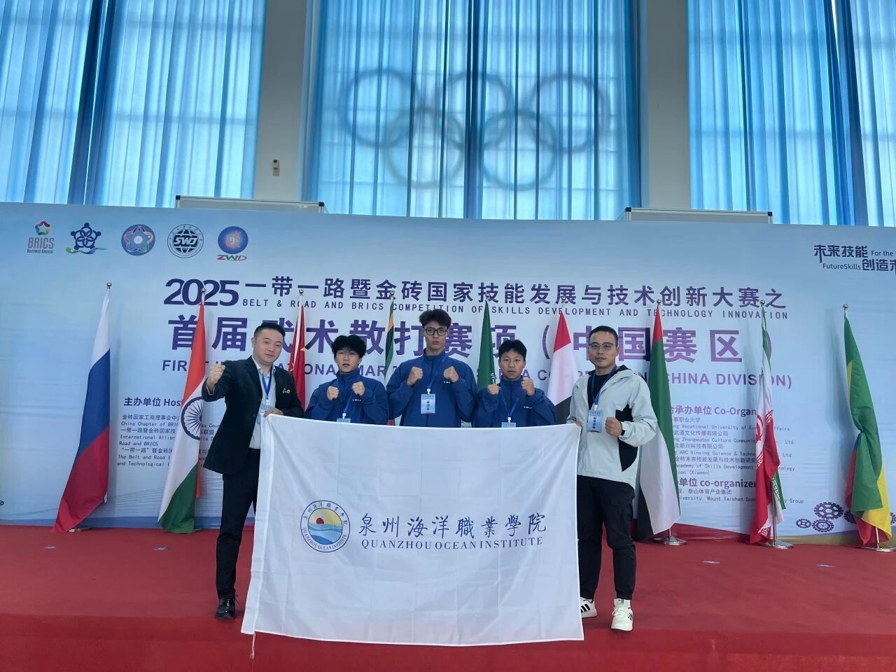 据悉,本次大赛经中华人民共和国外交部备案、金砖国家工商理事会批准,汇聚了全国60余所院校、400多名顶尖武术散打健儿同台竞技。赛前,两位老师科学制定训练计划,精准打磨技术战术,陪伴队员度过无数个挥汗如雨的日夜。赛中,我院两名同学沉着应战,两位老师全程给予精准指导,及时调整策略应对。最终,我院庄睿健同学获男子60kg级三等奖;顾明灏同学获男子70kg级三等奖。两位学子在赛场上打出风格、赛出水平,将泉海人的坚韧与智慧展现得淋漓尽致。此次成绩的取得正是学校体育人才培养质量的生动印证。