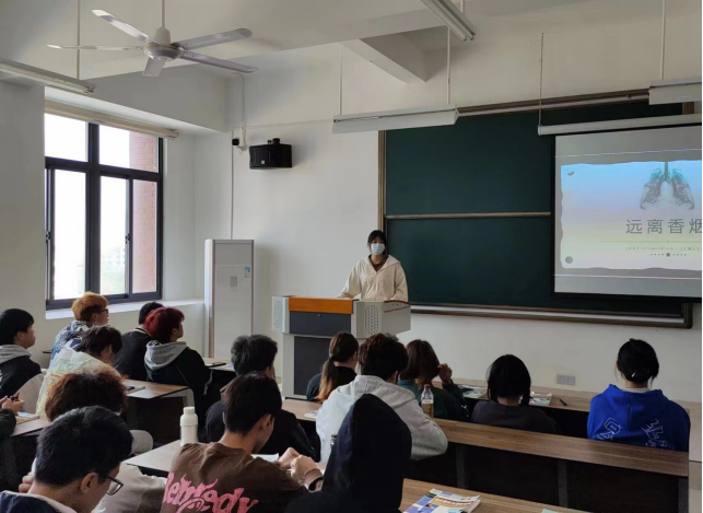 2022级辅导员刘清萍从“人们对吸烟认知上存在的误区”、“吸烟的危害和戒烟的益处”、“如何戒烟”等方面对学生们进行禁烟教育宣传。