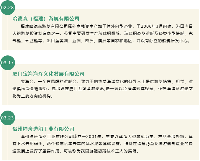 可以说,这三家公司都是福建省内游艇行业中的佼佼者,涵盖了从游艇设计、制造、出口到游艇配套休闲服务、会所运营等诸多方面。