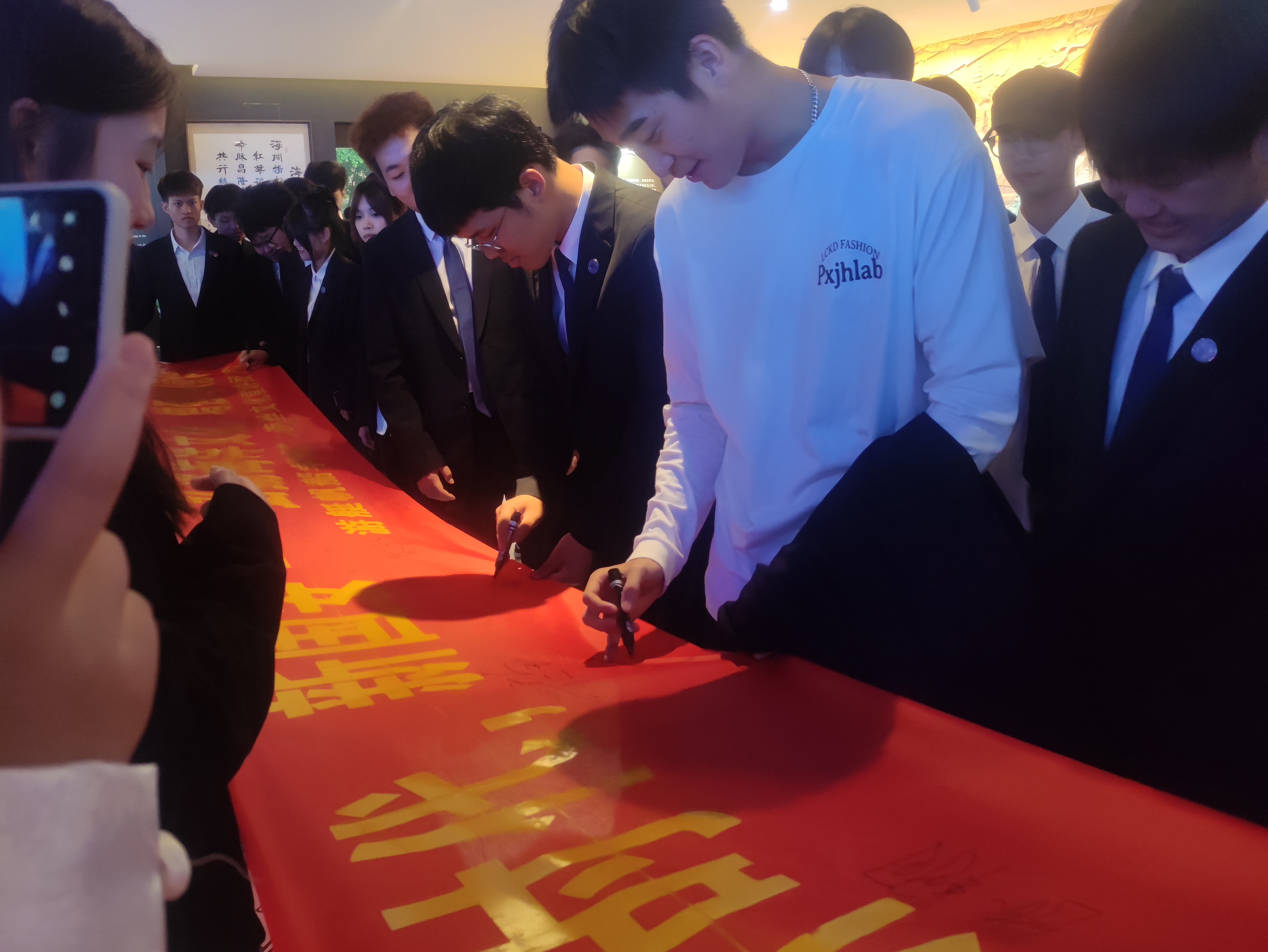 在参观结束后,游艇帆船学院学生们集体在“弘扬海洋文化,增强海权意识”的横幅上签下了自己的名字。