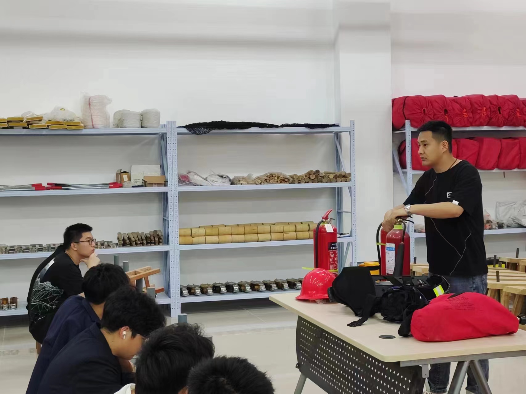 唐老师开场重点强调:“消防消防,预防为主。”他先是以干粉灭火器、二氧化碳灭火器等较为常见的灭火器种类作为开场,结合火灾发生原因三要素:助燃剂、可燃物、引火源,再进一步引出不同种类灭火器的工作原理以及使用时的注意事项。除此之外,还有气瓶、防护面罩等紧急逃生设备的检查和使用方法,并邀请学生上前体验。