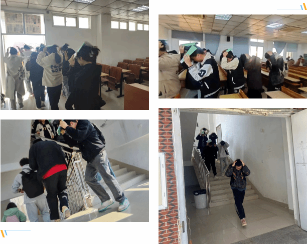 当演练信号响起时,学生们纷纷用书本保护头部,在老师的指导下迅速有序地分别从安全通道紧急疏散到安全、空旷的场所。