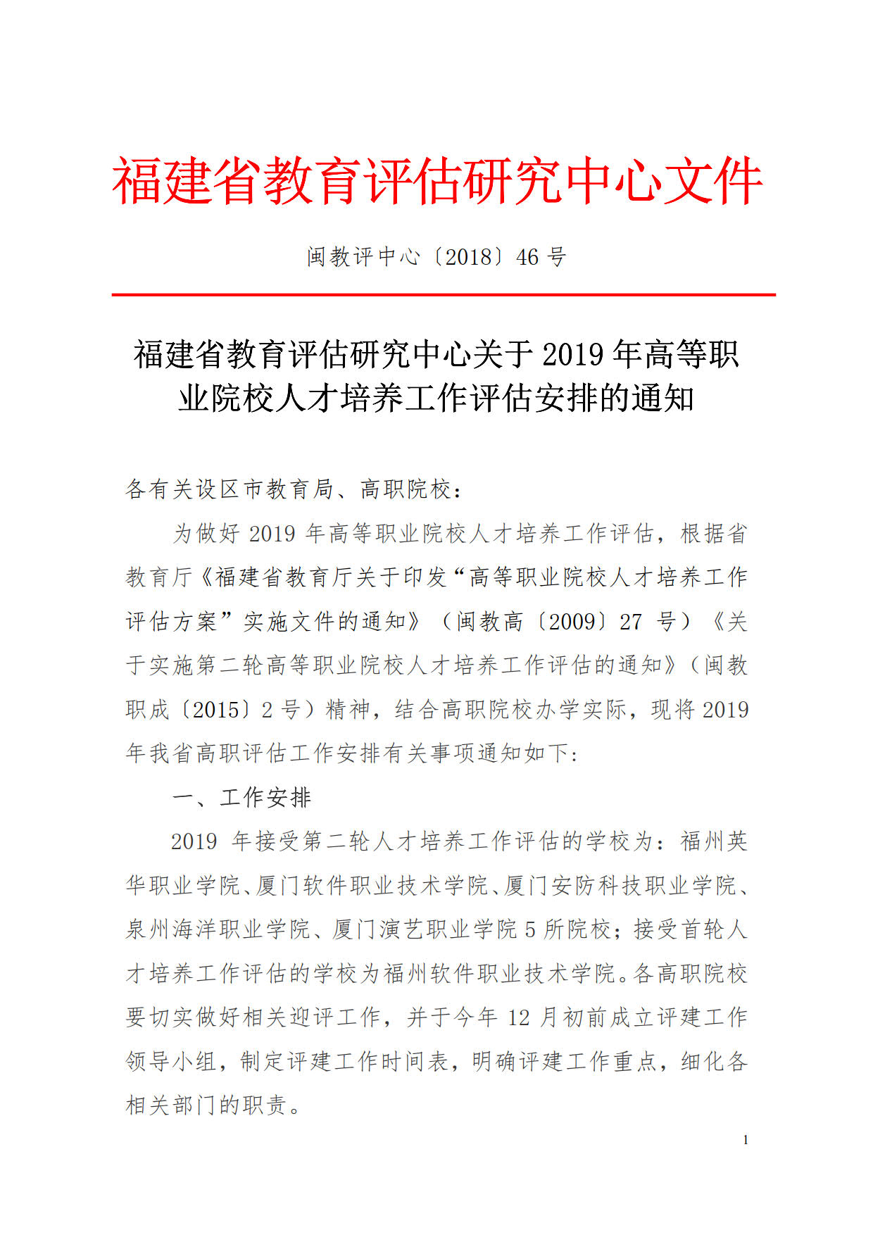 福建省教育评估研究中心关于2019年高等职业院校人才培养工作评估安排的通知