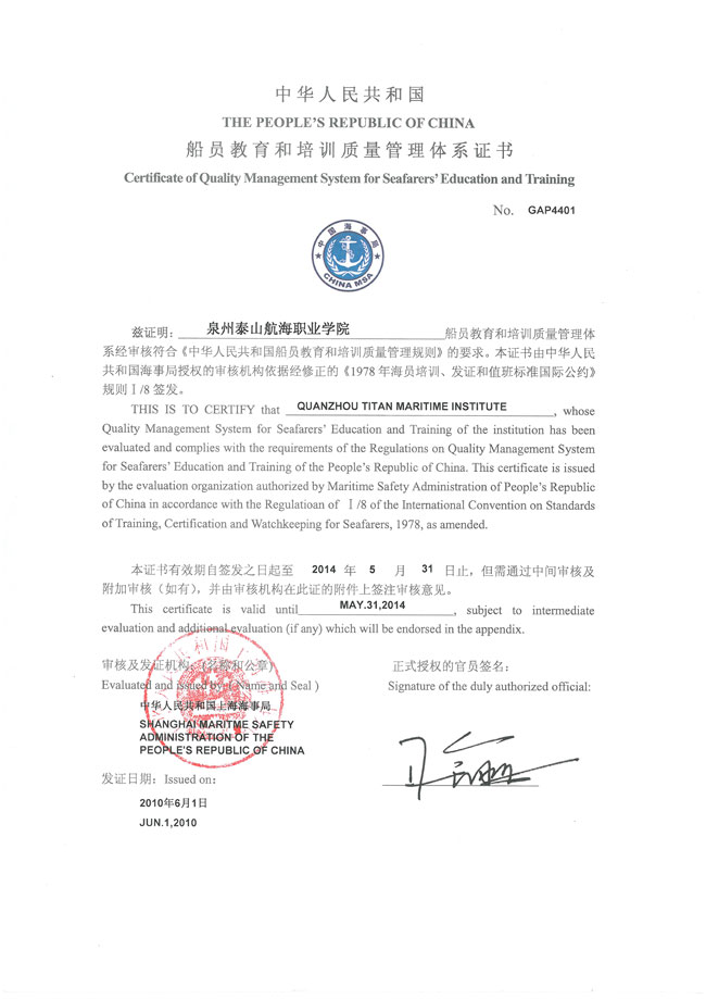 中华人民共和国船员教育和培训质量管理体系证书