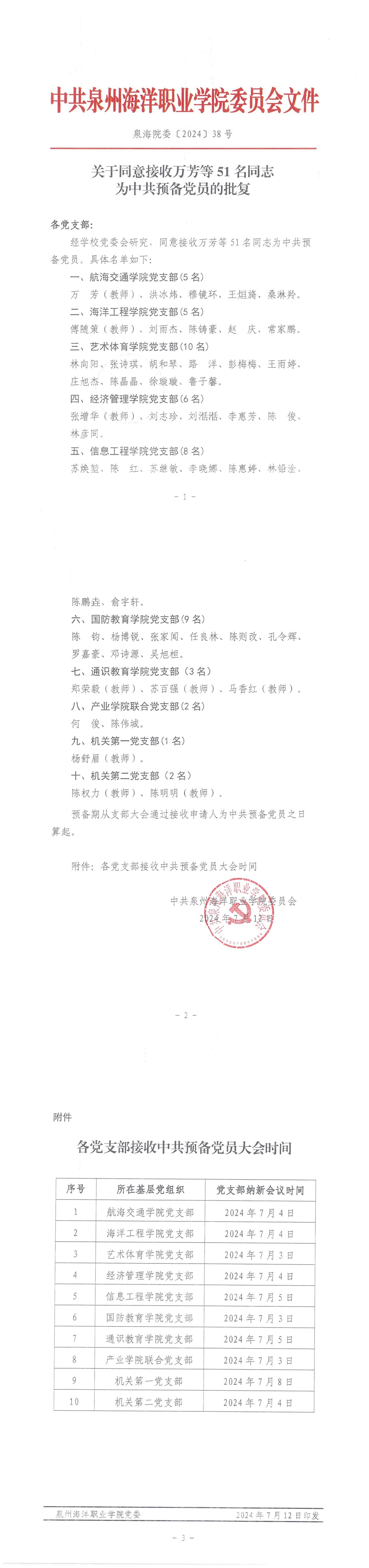 泉海院委〔2024〕38号 关于同意接收万芳等51名同志为中共预备党员的批复