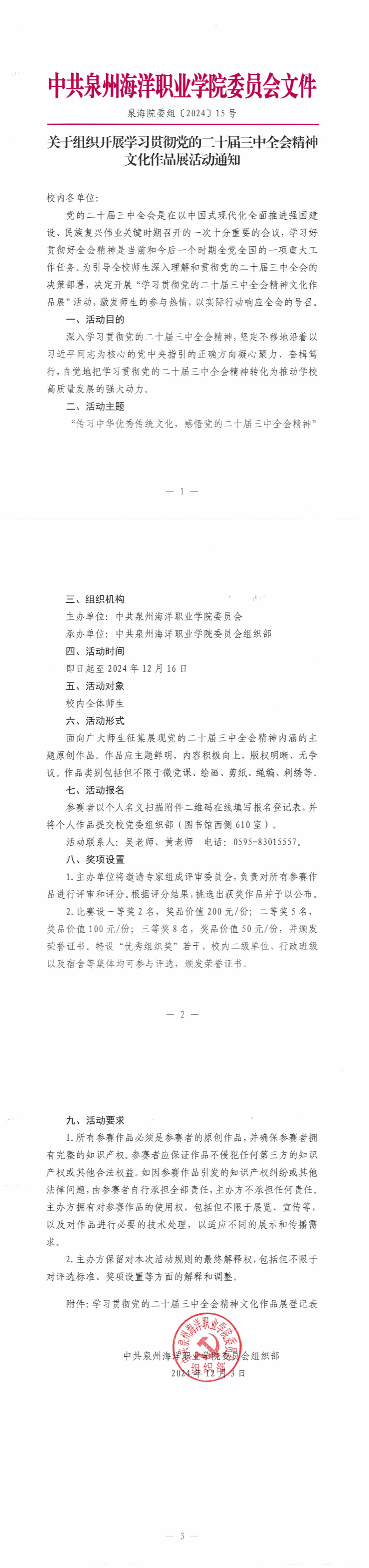 泉海院委组〔2024〕15号 关于组织开展学习贯彻党的二十届三中全会精神文化作品展活动通知