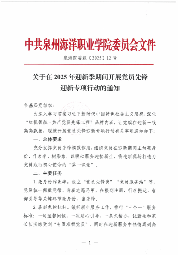 泉海院委组〔2025〕12号 关于在2025年迎新季期间开展党员先锋迎新专项行动的通知