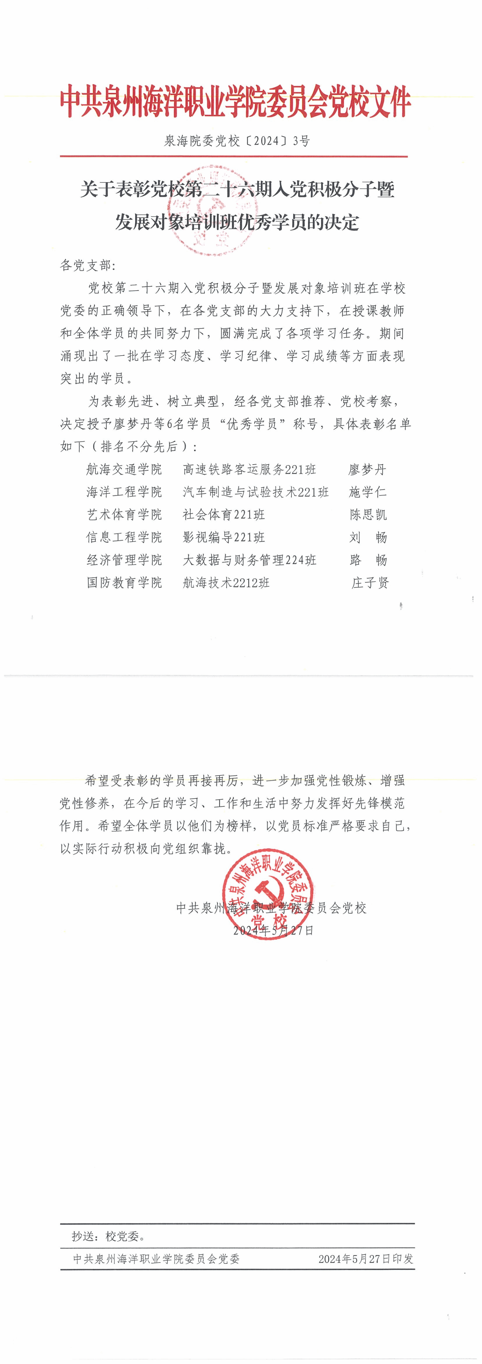 泉海院委党校〔2024〕3号 关于表彰党校第二十六期入党积极分子培训班优秀学员的决定