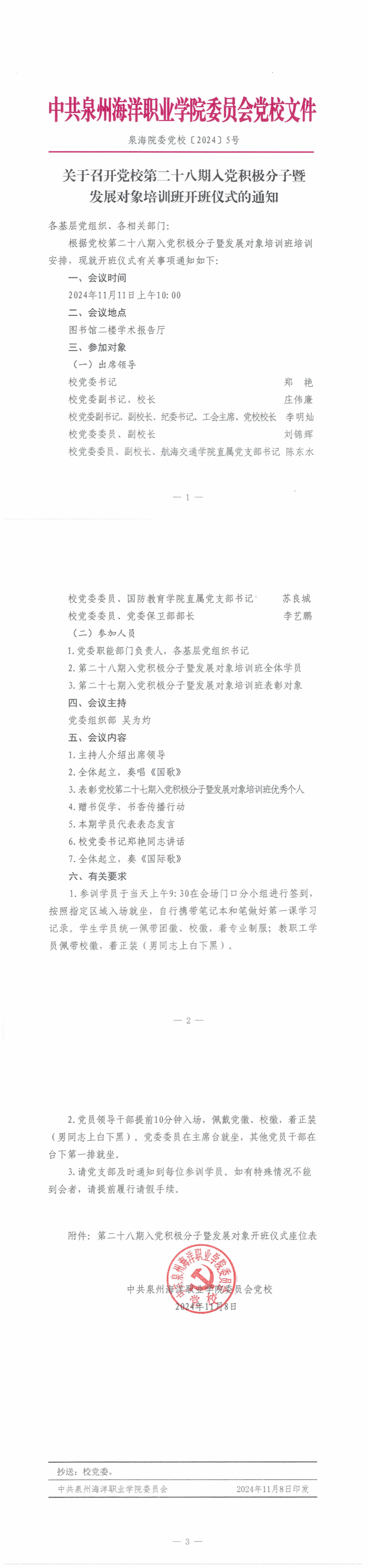 泉海院委党校〔2024〕5号 关于召开党校第二十八期入党积极分子暨发展对象培训班开班仪式的通知