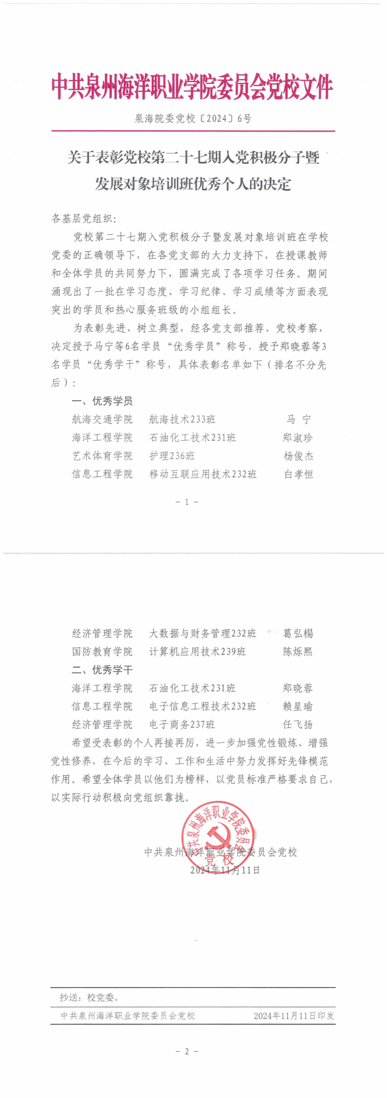 泉海院委党校〔2024〕6号 关于表彰党校第二十七期入党积极分子暨发展对象培训班优秀个人的决定