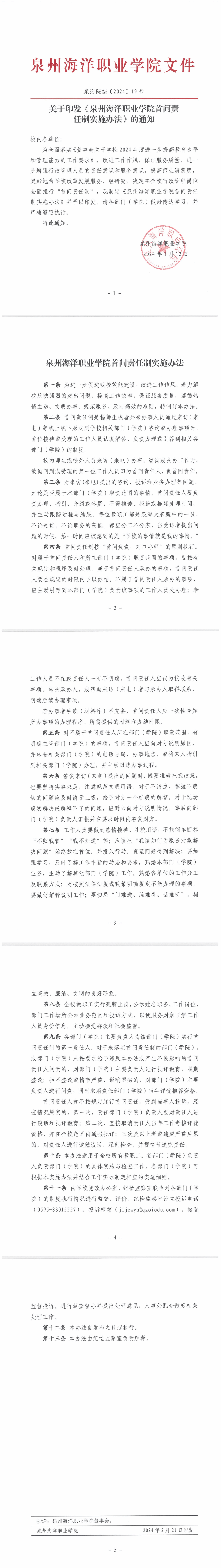 泉海院综〔2024〕19号 关于印发《泉州海洋职业学院首问责任制实施办法》的通知