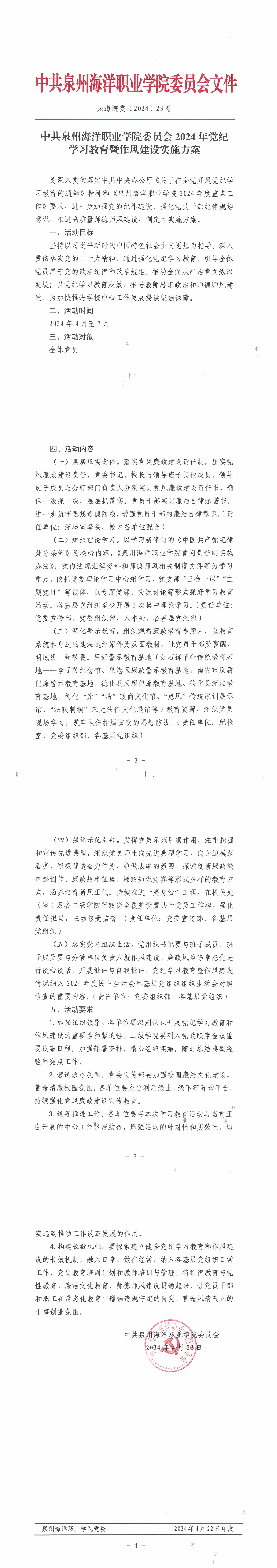 泉海院委〔2024〕23号 中共泉州海洋职业学院委员会2024年党纪学习教育暨作风建设实施方案