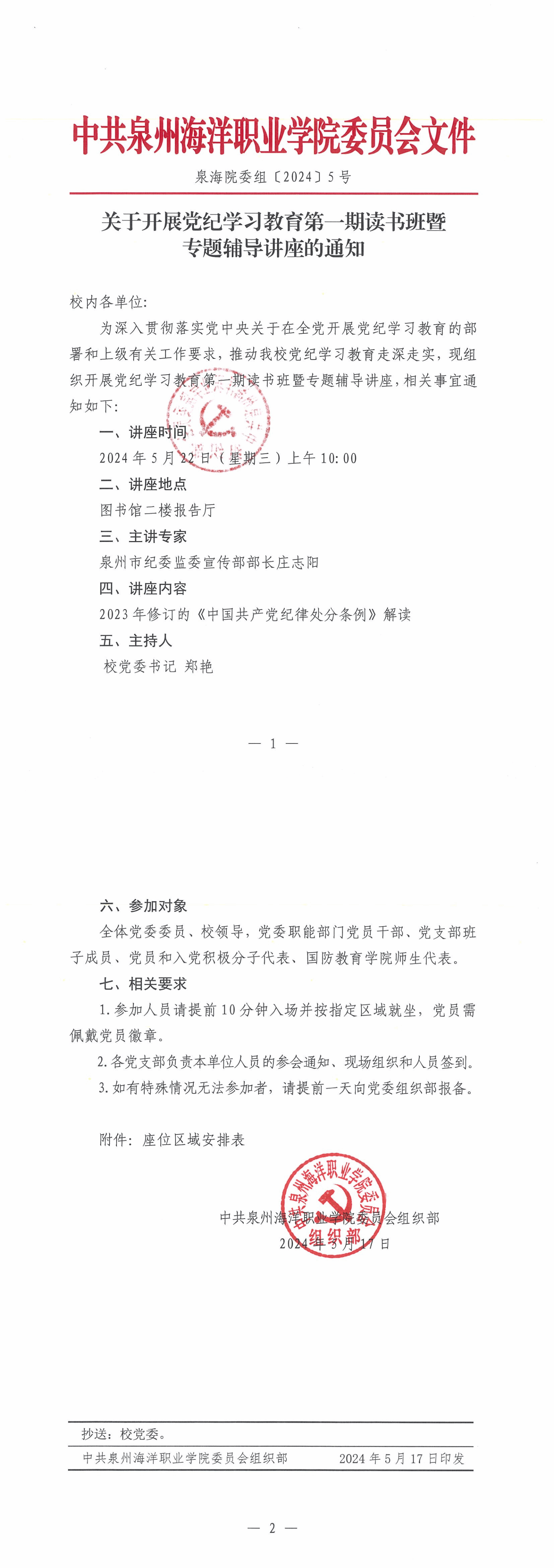 泉海院委组〔2024〕5号 关于开展党纪学习教育第一期读书班暨专题辅导讲座的通知