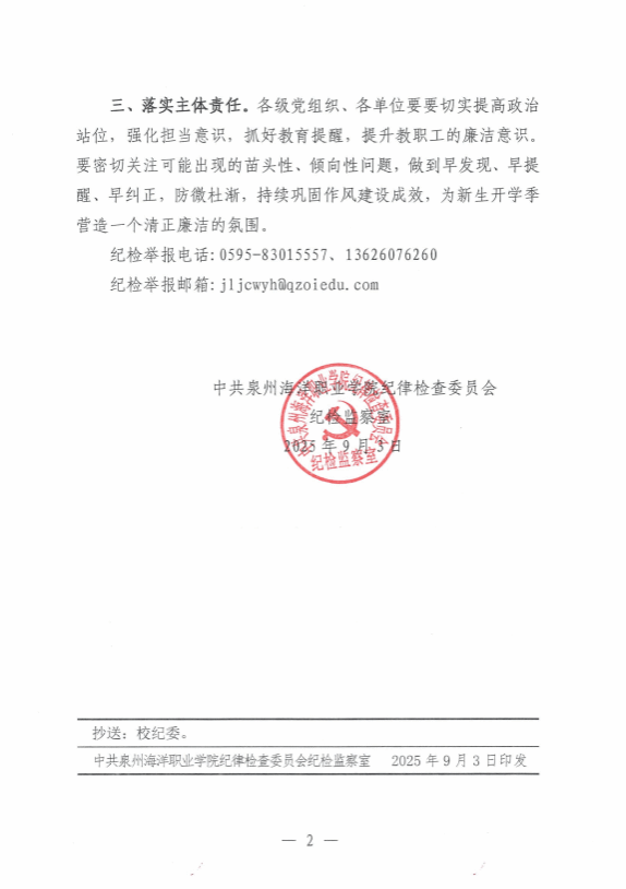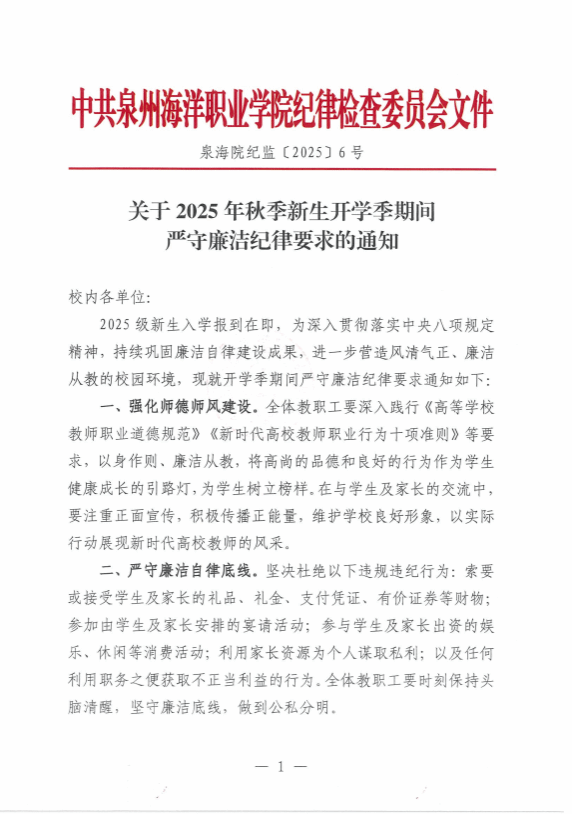 泉海院纪监〔2025〕6号 关于2025年秋季新生开学季期间严守廉洁纪律要求的通知
