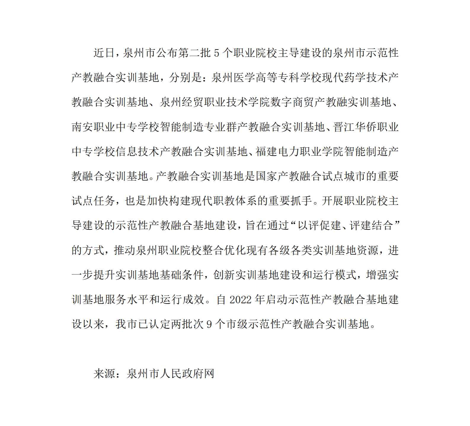 泉州市公布第二批示范性产教融合实训基地
