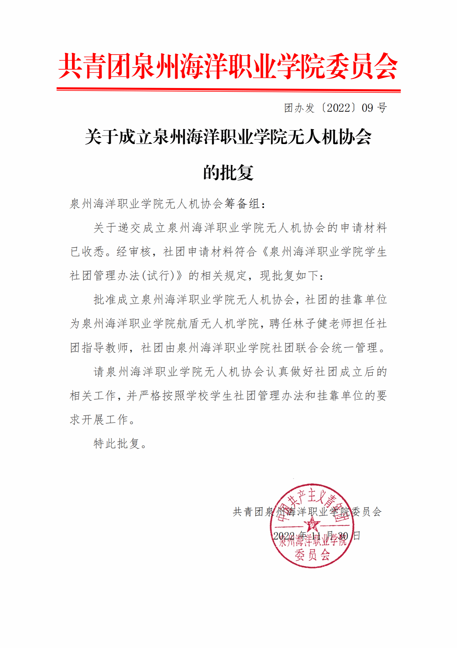 1.关于成立泉州海洋职业学院无人机协会【团办发〔2022〕09号】