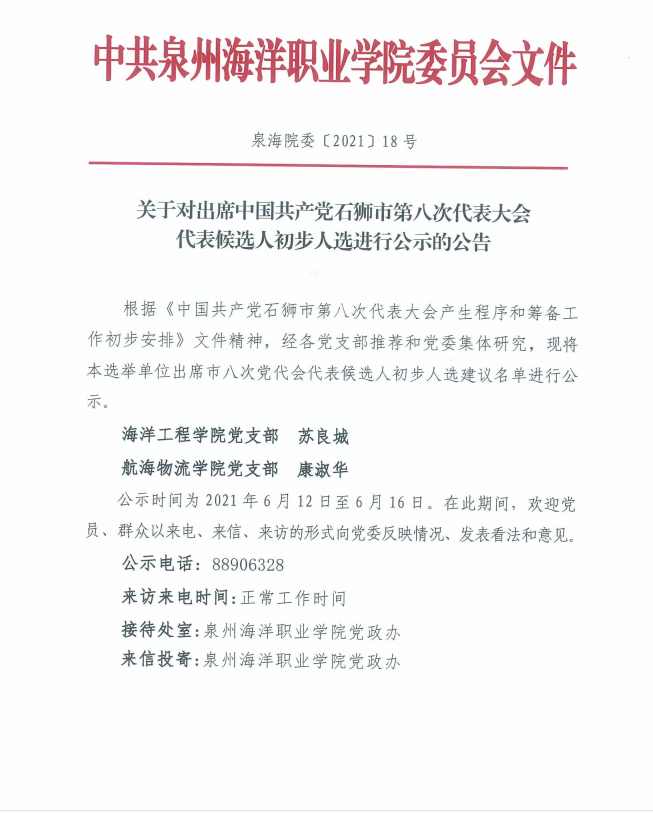 泉海院委〔 2021〕18号 出席中国共产党石狮市第八次代表大会代表候选人初步人选公示