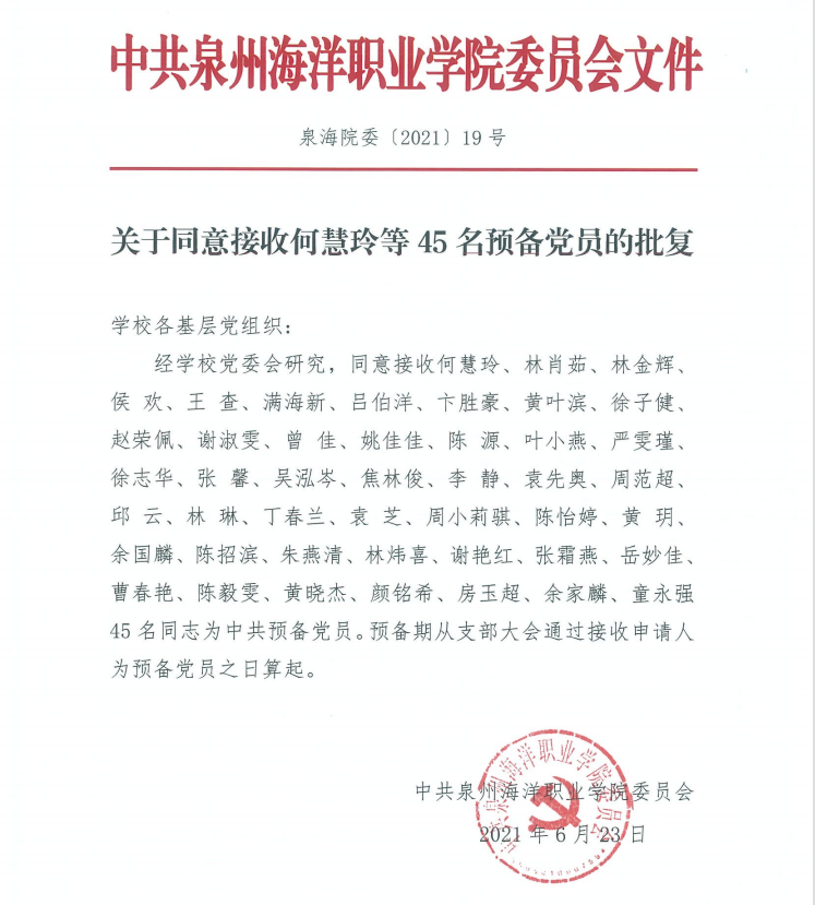 泉海院委〔2021) 19号 关于同意接收何慧玲等45名预备党员的批复