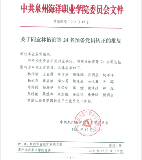泉海院委〔2021〕49号 关于同意林怡滨等24名预备党员转正的批复