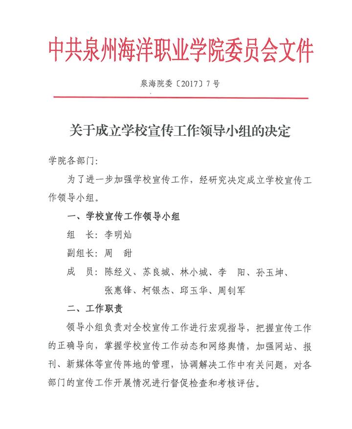 泉海院委〔2017〕7号 关于成立学院宣传工作领导小组的决定