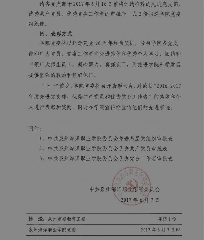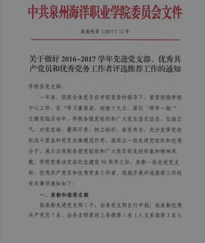 泉海院委〔2017〕12号 关于开展2016-2017学年“一先两优”评选工作的通知