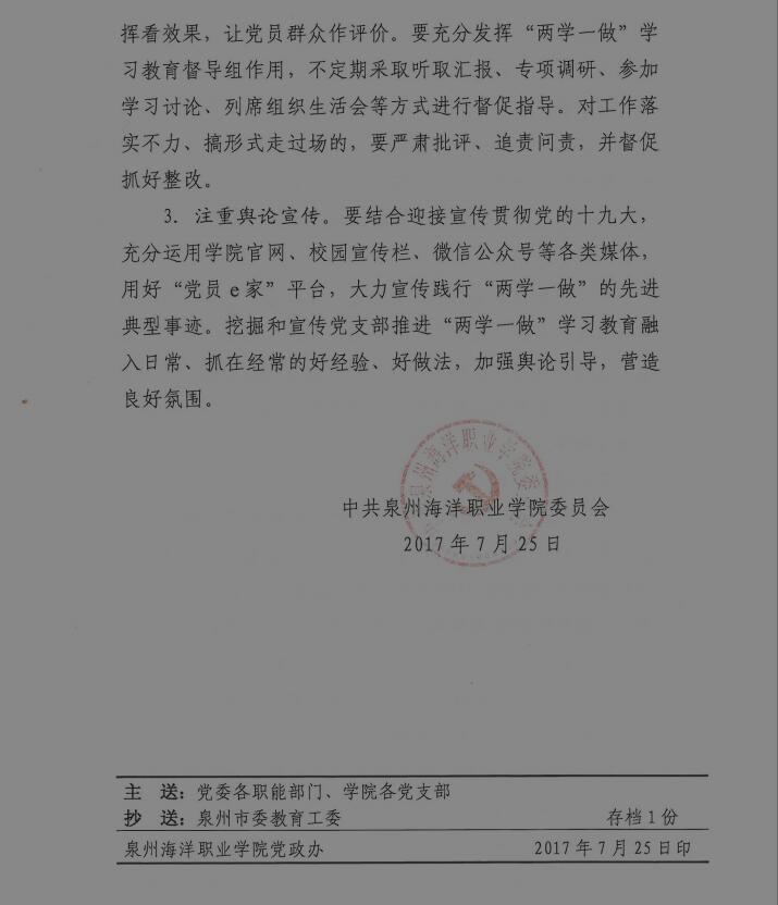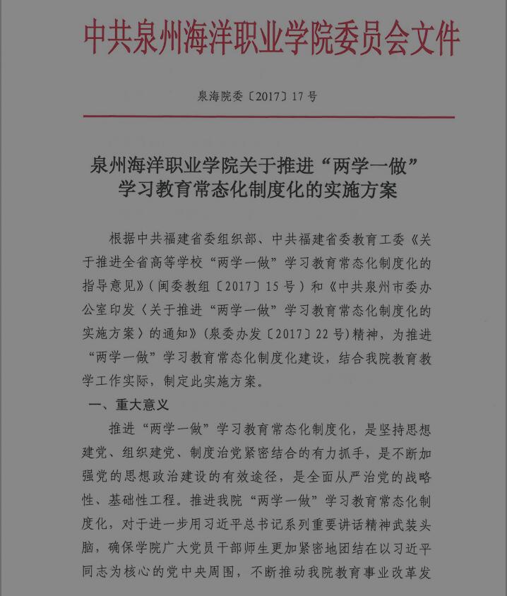 泉海院委〔2017〕17号 泉州海洋职业学院关于推进“两学一做”学习教育常态化制度化的实施方案