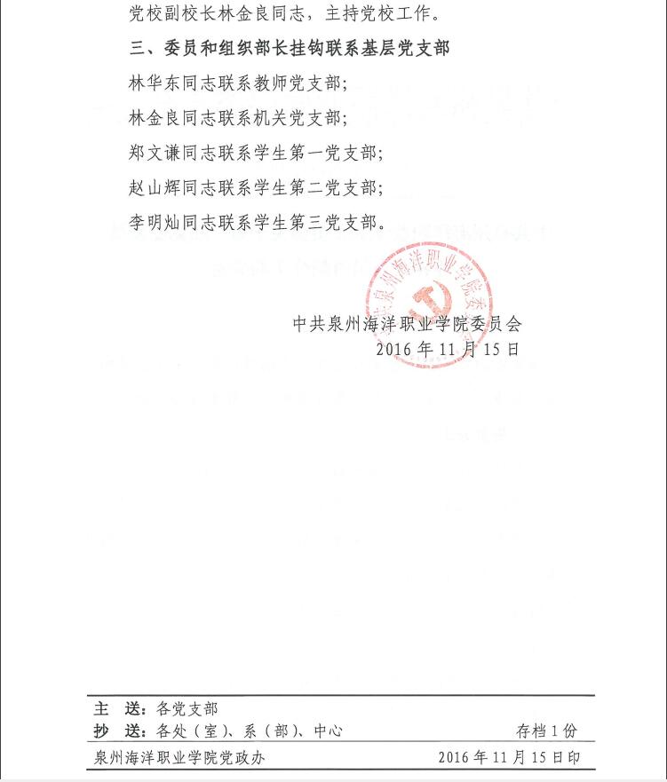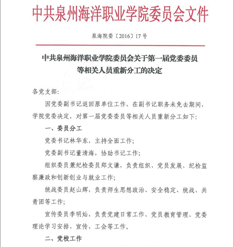 中共泉州海洋职业学院委员会关于第一届党委委员等相关人员重新分工的决定(泉海院委〔2016〕17号)