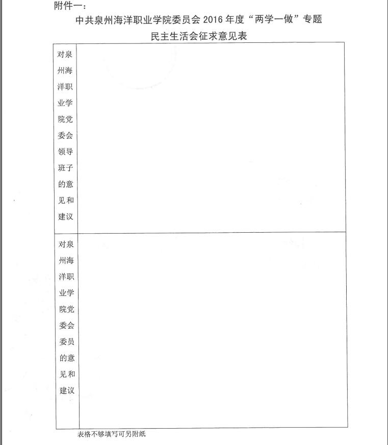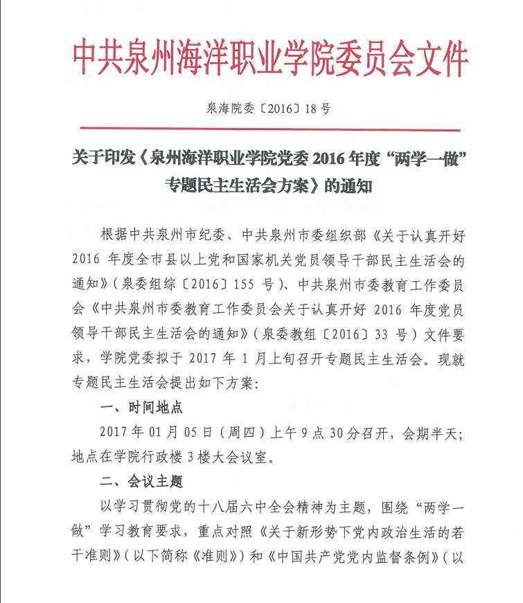 关于印发《泉州海洋职业学院党委2016年度“两学一做”专题民主生活会方案》的通知
