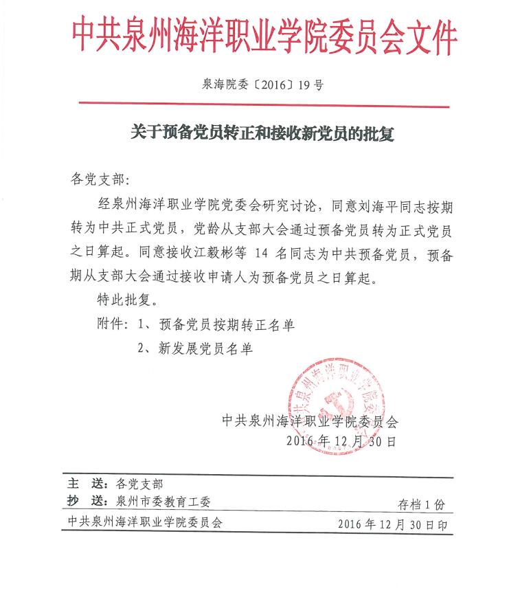 关于预备党员转正和接收新党员的批复(泉海院委〔2016〕19号)