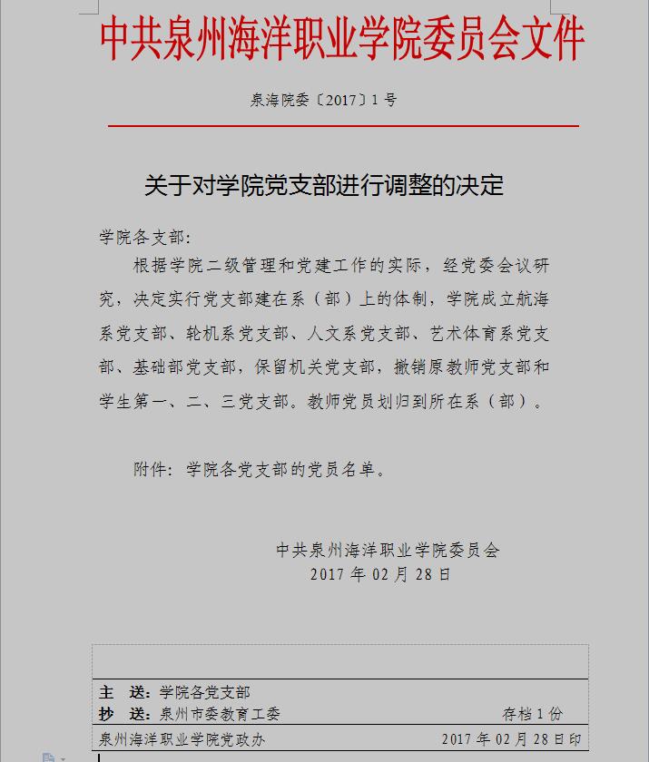 泉海院委〔2017〕1号 关于对学院党支部进行调整的决定