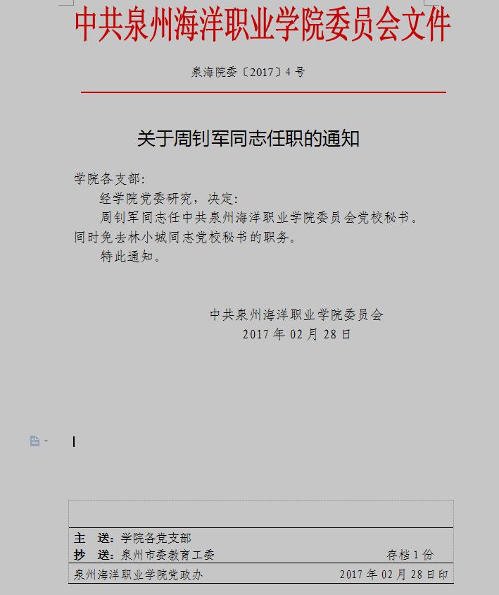 泉海院委〔2017〕4号 关于周钊军同志任职的通知