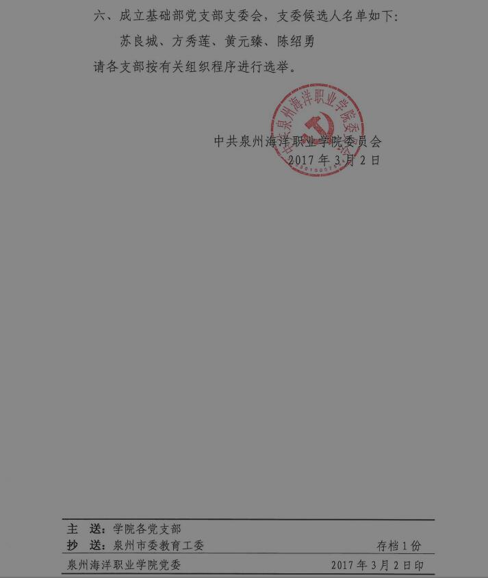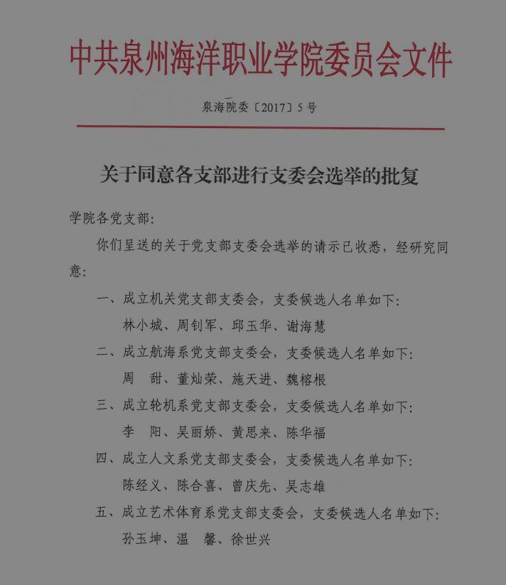 泉海院委〔2017〕5号 关于同意各支部进行支委会选举的批复