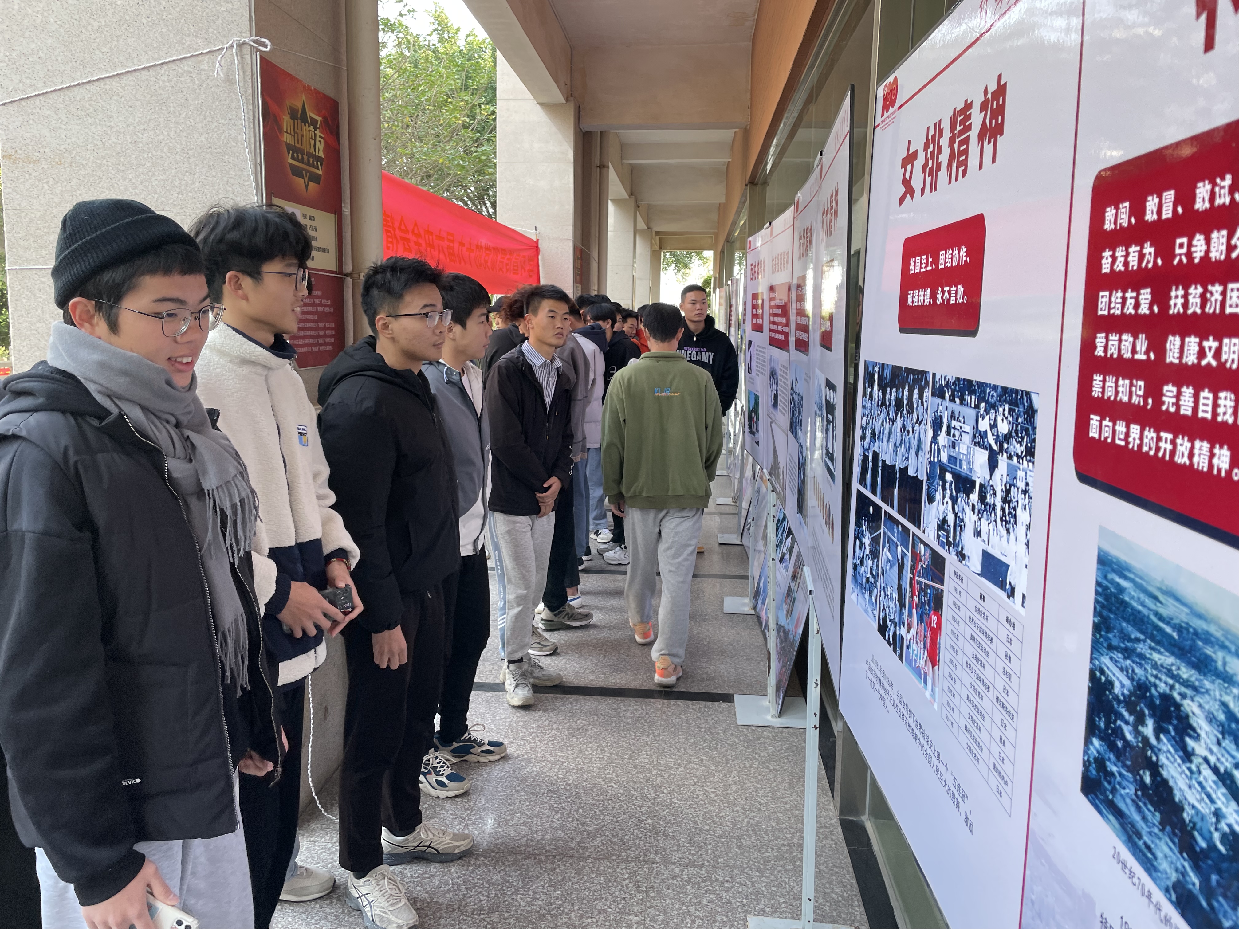 本次图片展展示了学习宣传贯彻党的十九届六中全会精神,加快构建中国特色哲学社会科学的重要观点和重要思想,并重点展示了以红船精神、井冈山精神、长征精神、遵义会议精神、古田会议精神、延安精神、抗战精神、西柏坡精神等为代表的革命精神,以抗美援朝精神、大庆精神、雷锋精神、焦裕禄精神、“两弹一星”精神等为代表的艰苦创业精神,以特区精神、女排精神、九八抗洪精神、载人航天精神、抗震救灾精神等为代表的改革开放精神,以伟大抗疫精神、伟大脱贫攻坚精神等为代表的新时代伟大奋斗精神等中国共产党的精神谱系。用图文并茂的方式,带领师生深刻感悟党的百年奋斗征程,大学生党建助理团成员现场同步开展讲解工作。