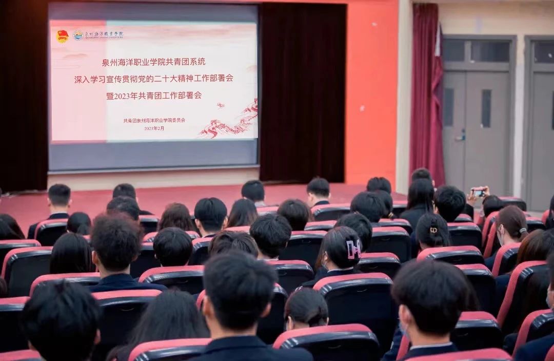 2月15日,泉州海洋职业学院共青团系统深入学习宣传贯彻党的二十大精神工作部署会暨 2023年共青团工作部署大会在2204报告厅隆重召开。出席此次大会的领导嘉宾有学工部部长张君,学工部副部长、校团委书记屈先锋,学工部思政科科长蔡岱宏,校团委干事林欣,二级学院团委(团工委)书记、副书记;校级学生组织主要负责人,二级学院团学组织团委、学生会负责人、学生社团第一负责人。会议由校团委兼职副书记蔡绮蓁主持。