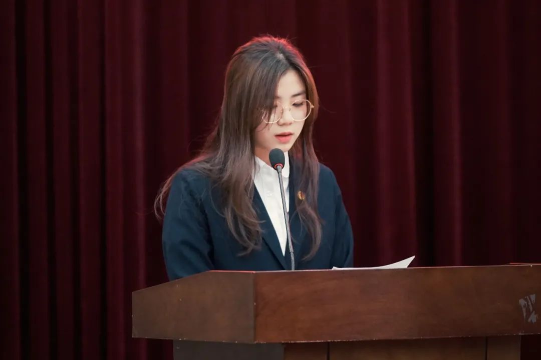 校团委干事林欣宣读《关于成立泉州海洋职业学院学习宣传贯彻党的二十大精神学生宣讲团的通知》、《关于泉州海洋职业学院学习宣传贯彻党的二十大精神学生宣讲团成员的聘任决定》。经二级学院、学生组织推荐、学生自荐。校团委考核,决定聘任张帅龙、蔡绮蓁等20名同学为泉州海洋职业学院学习宣传贯彻党的二十大精神学生宣讲团成员。