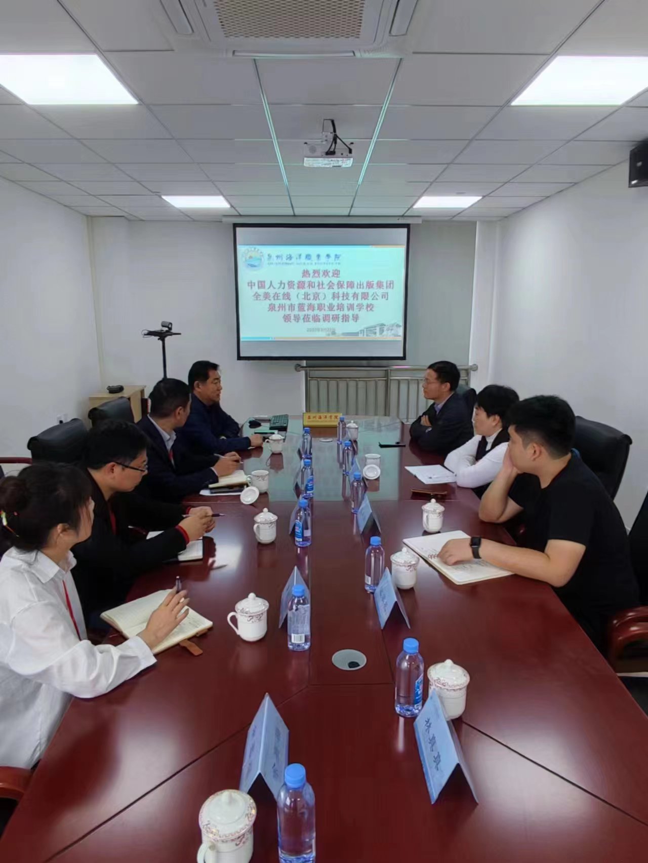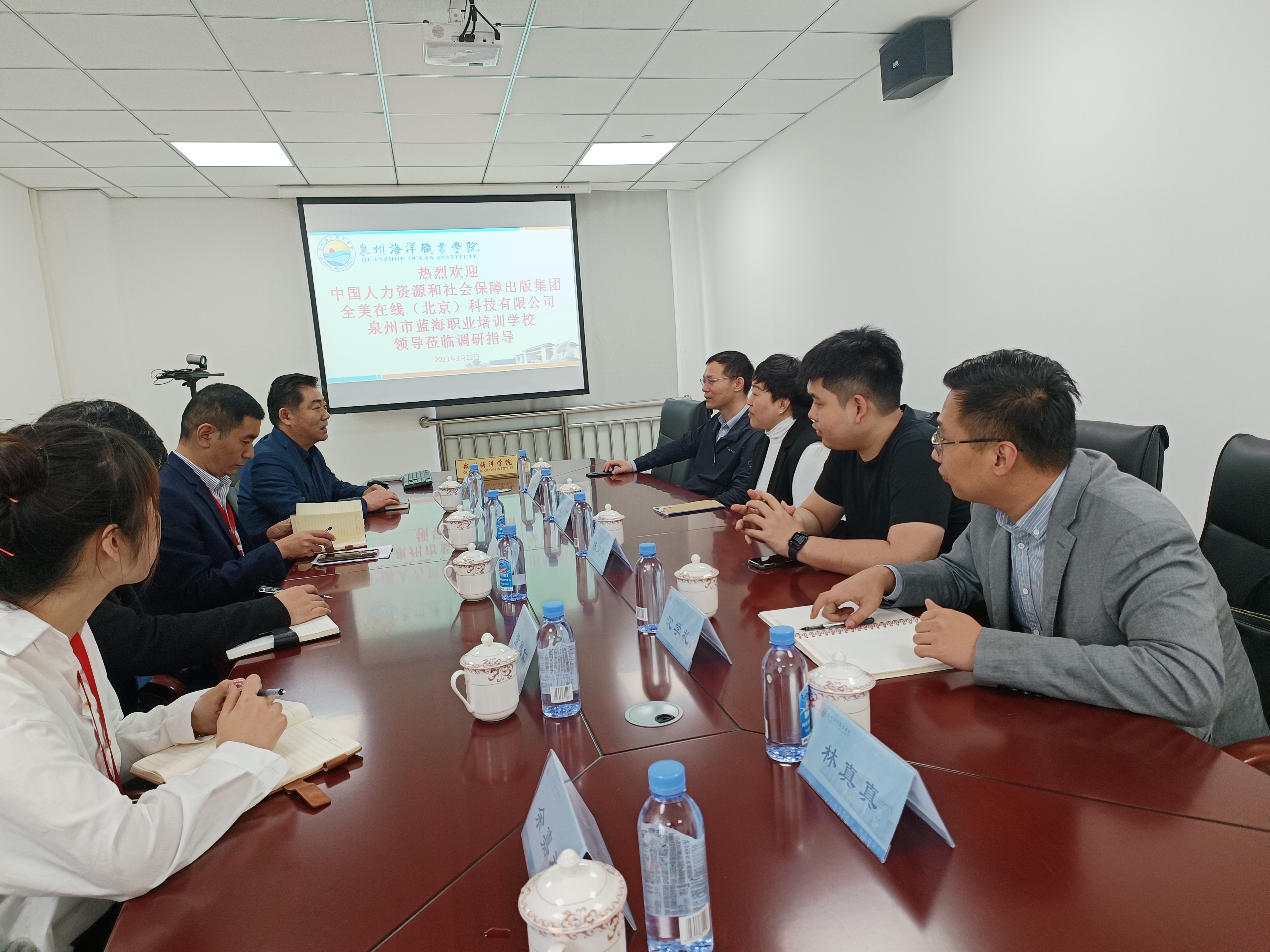 3月22日,中国人力资源和社会保障出版集团、全美在线(北京)科技有限公司、泉州市蓝海职业培训学校领导一行到我校参观交流,我校副校长王柏毅、继续教育学院院长徐燕兵、图书馆副主任林昭勇等陪同接待,双方就产教融合、职业技能培训、新型学徒制等事宜展开讨论交流。