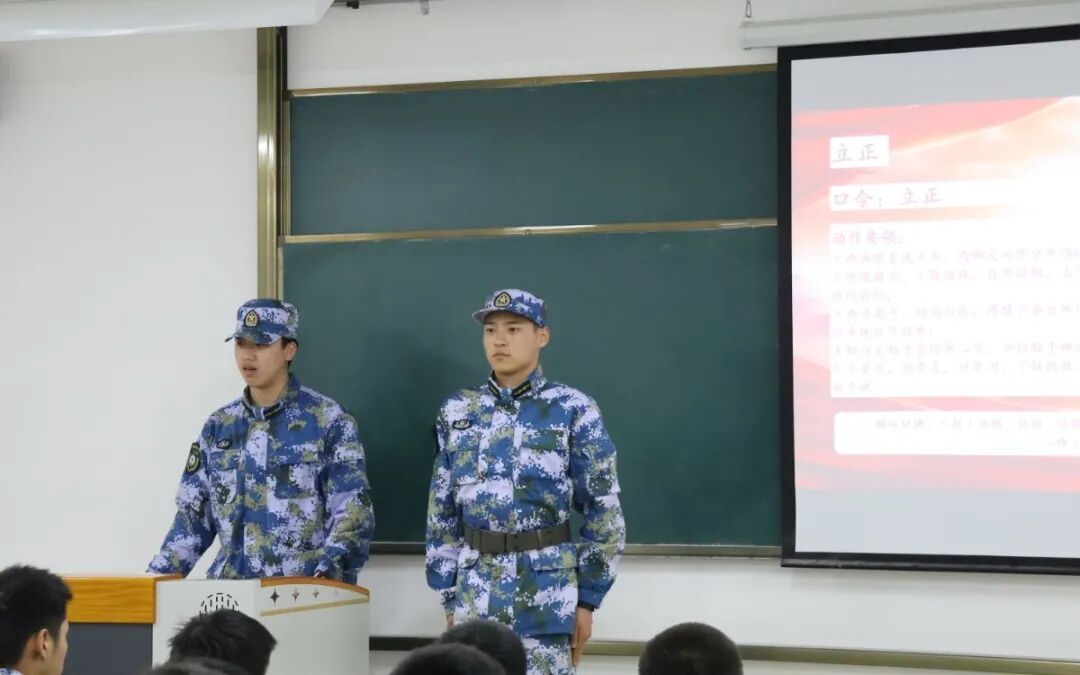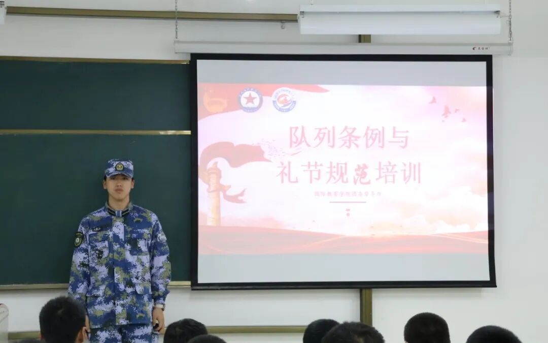 国防教育学院督导部负责人张博涵同学向学干成长营全体学员讲授关于重温队列条例,严抓礼节礼貌的相关内容。他强调,作为国防教育学院的骨干,一言一行皆是形象,一举一动皆显作风。并由一大队中队长张皓翔上台做示范,标准的动作、严谨的作风赢得了现场学员的阵阵掌声。