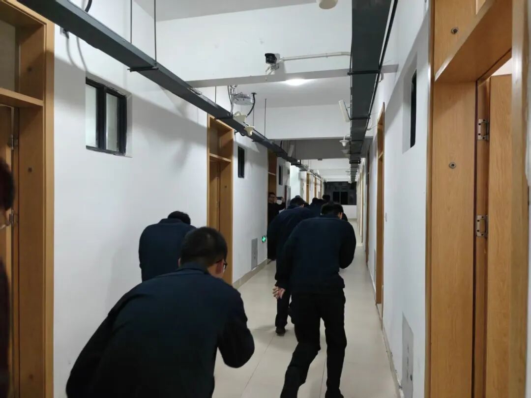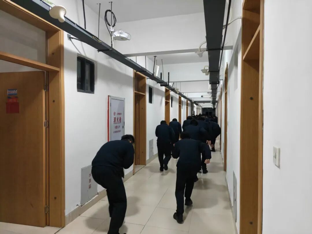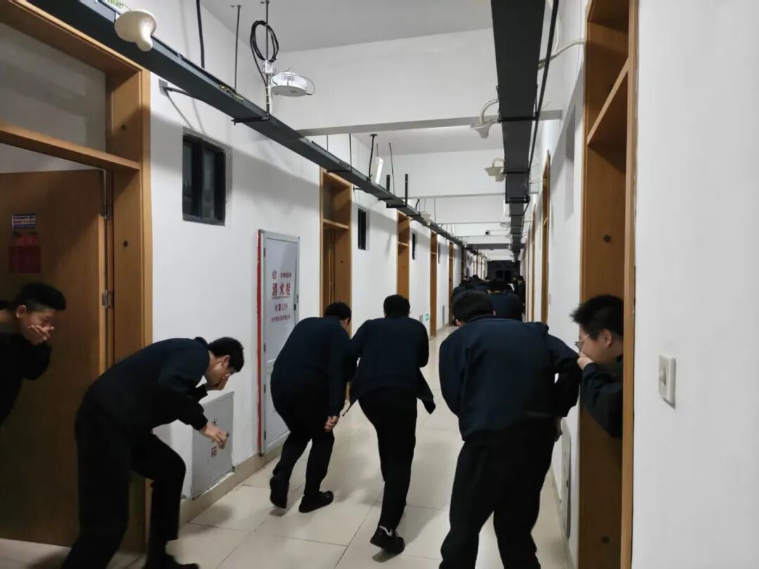 演练警报响起后,全体成员迅速响应,严格遵循消防逃生规范,用手捂住口鼻、弯腰低姿,沿宿舍楼道预定疏散路线快速、有序撤离。整个过程中,同学们动作标准,无推挤、无喧哗,迅速从宿舍楼撤离至楼下安全区域。带队教官全程现场指挥,精准把控疏散节奏,规范逃生动作,确保演练全程安全高效。