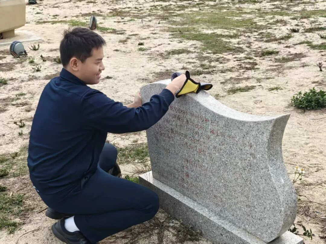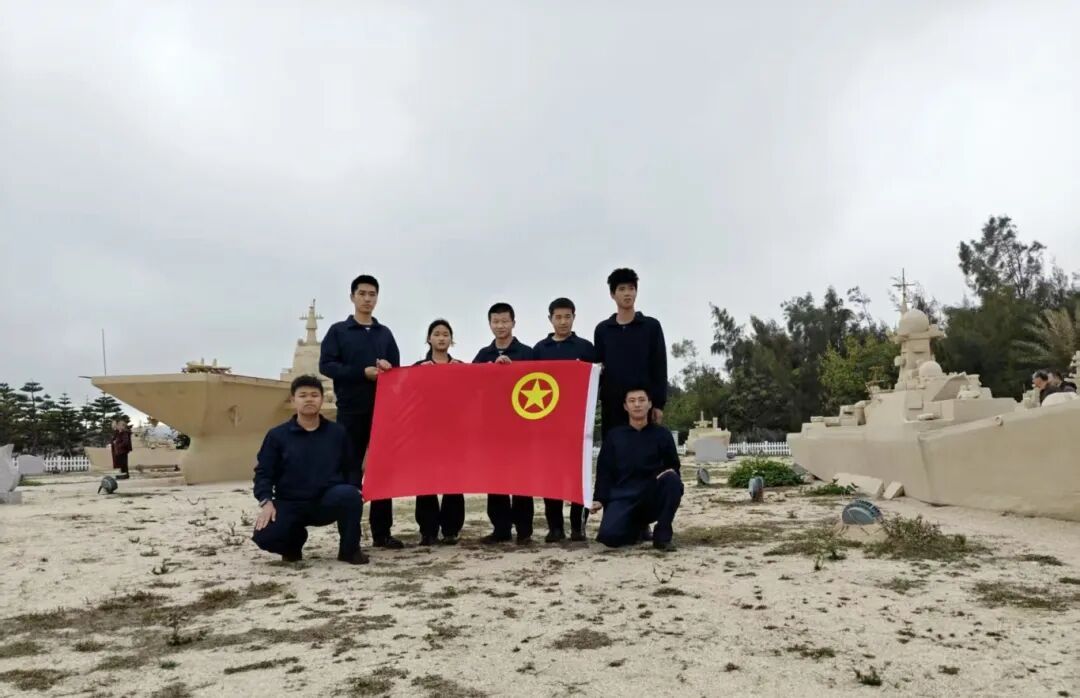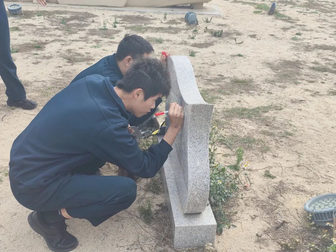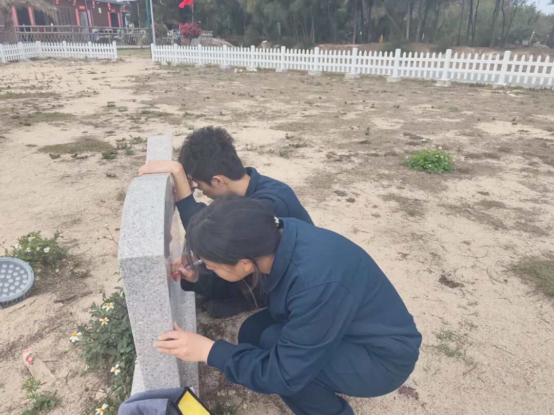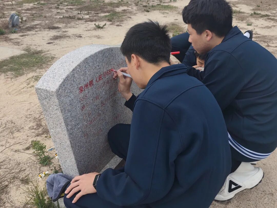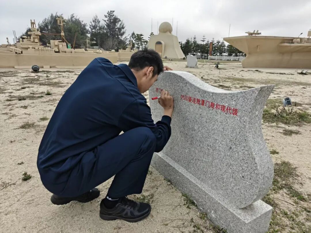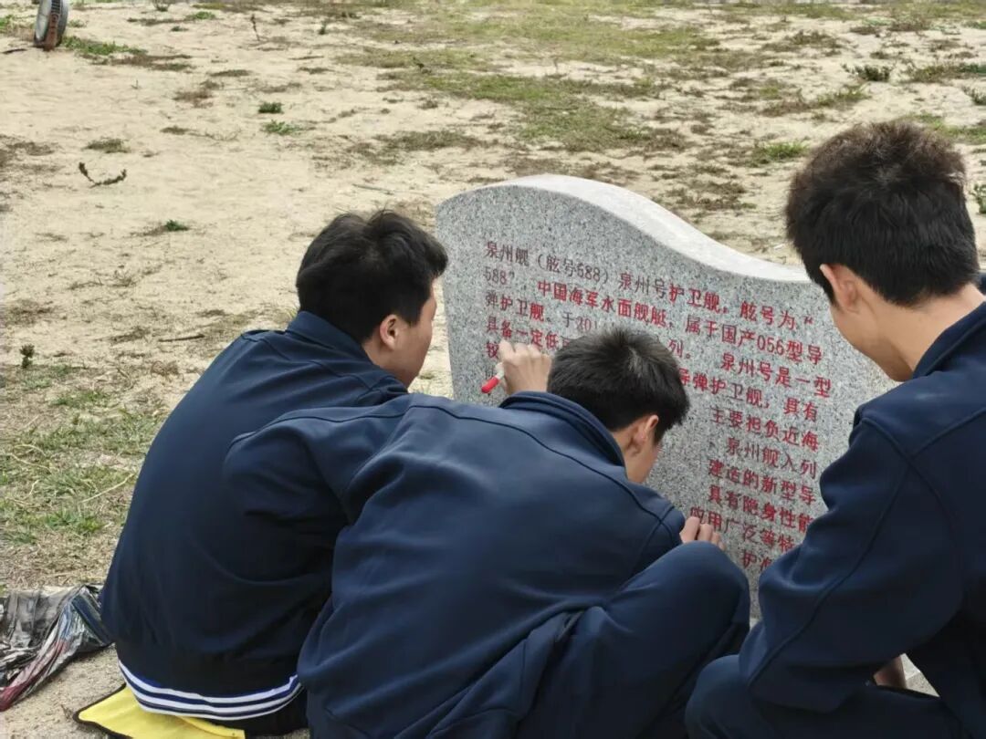 清理结束后,同学们拿起清洁抹布,仔细擦拭着军舰石碑,拂去岁月尘埃,让石碑上的文字重新焕发光泽。随后,大家手持描红笔,沿着石碑上的红色字迹认真描摹。“泉州舰(舷号588)”“中国自行研制设计建造”等文字在笔尖下愈发清晰,团员们在一笔一画中,重温人民海军的强军征程,感悟先辈们保家卫国的初心使命。