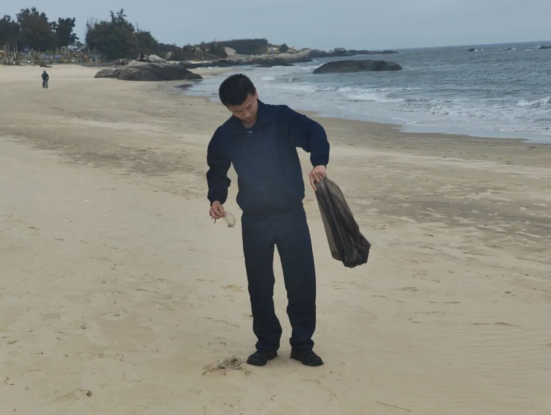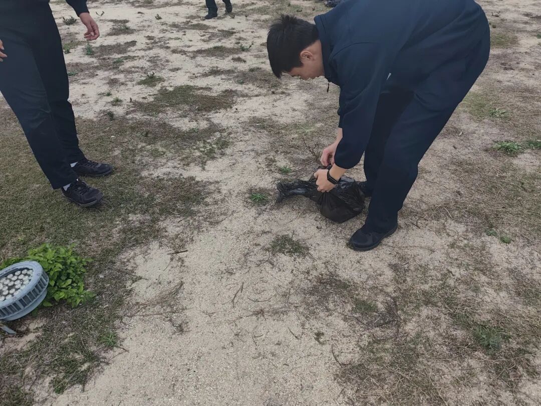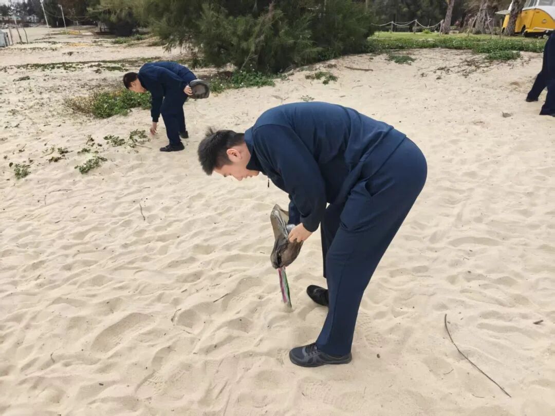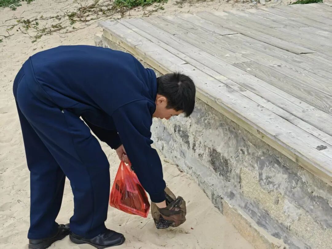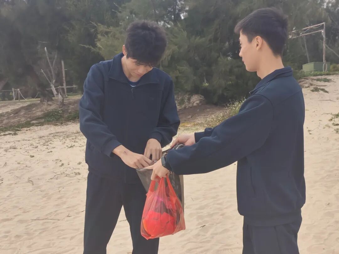 同学们手持垃圾袋与清洁工具,对军事公园的沙滩及石碑周边区域进行了全面清理。大家仔细捡拾散落的塑料瓶、纸屑等垃圾,用实际行动守护着这片承载海防记忆的土地。从岸边浅滩到石碑基座周围,原本散落的垃圾被逐一清除,蒙尘的场地渐渐恢复整洁,在众人的努力下变得清爽干净,公园内的军舰模型与石碑也因此愈发醒目。