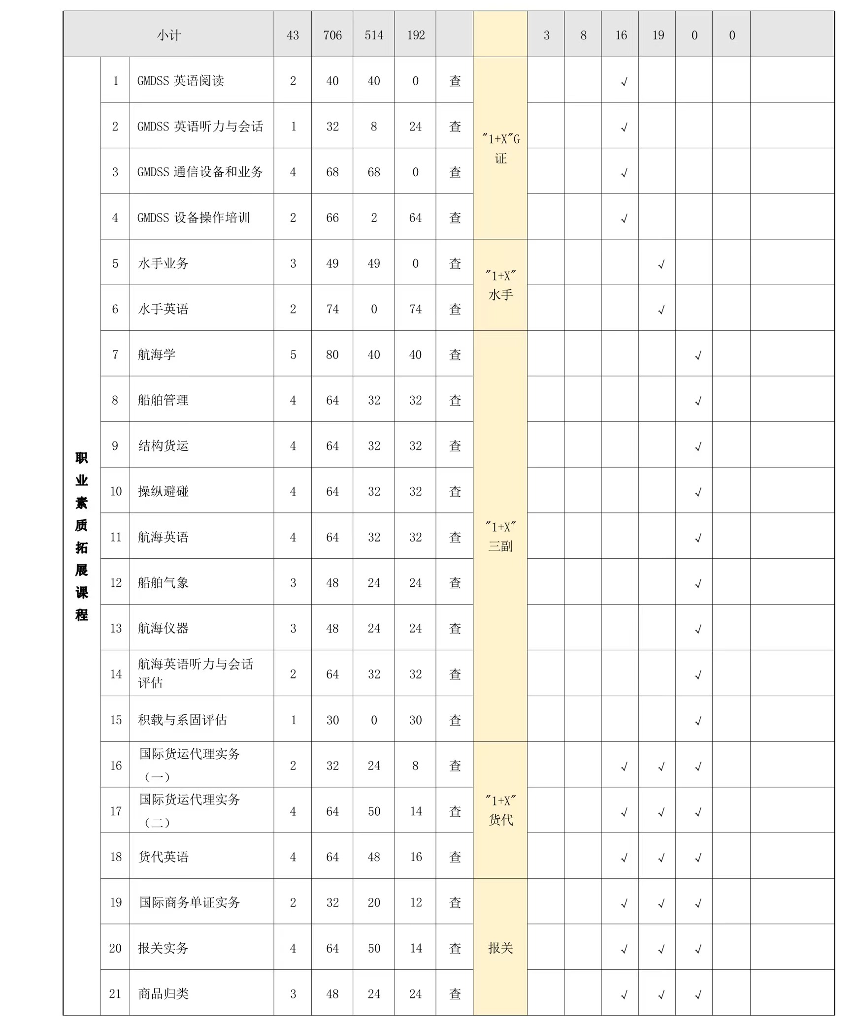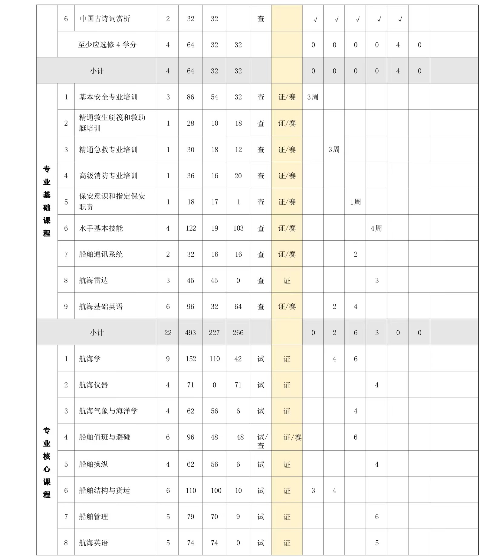 知识要求:掌握大学英语、计算机应用基础、体育与健康、思想道德修养与法律基础、毛泽东思想和中国特色社会主义理论体系概论的相关知识。根据《1978/10海船船员培训、发证和值班标准国际公约》、《中华人民共和国海船船员适任考试和发证规则》和《海船船员培训大纲(2021版)》的要求,经过三年系统的有针对性的理论学习和实践训练。具有航行与值班,货物装卸和积载,船舶作业管理和人员管理专业基础、核心和拓展的知识,具备航线设计、航海仪器的使用、ECDIS导航、雷达操作与应用、驾驶台资源管理、货物积载系固、航海英语听力与会话专业实践的基础与应用知识,获取基本安全、保安意识和指定保安职责、高级消防、精通急救、精通救生艇筏和救助艇、GMDSS通用操作员、值班水手、三副适任证书等证照所需的知识,以及整合专业基础能力课程、职业素质课程、专业核心能力课程、专业及素质拓展课程、集中实践课程等专业知识的模块。